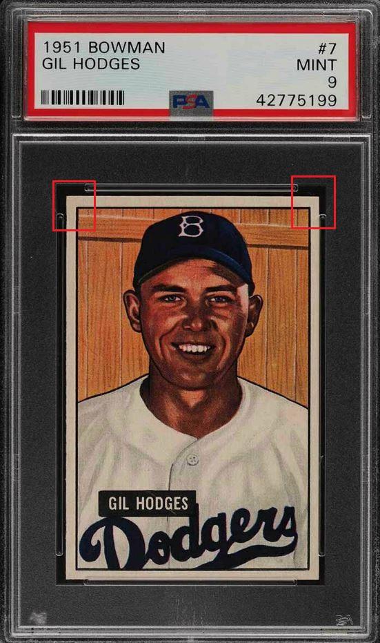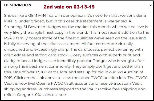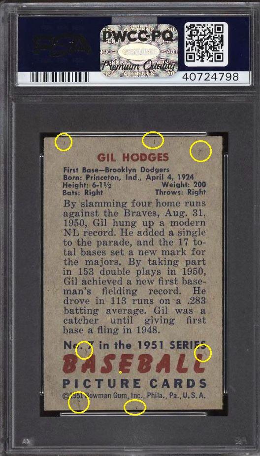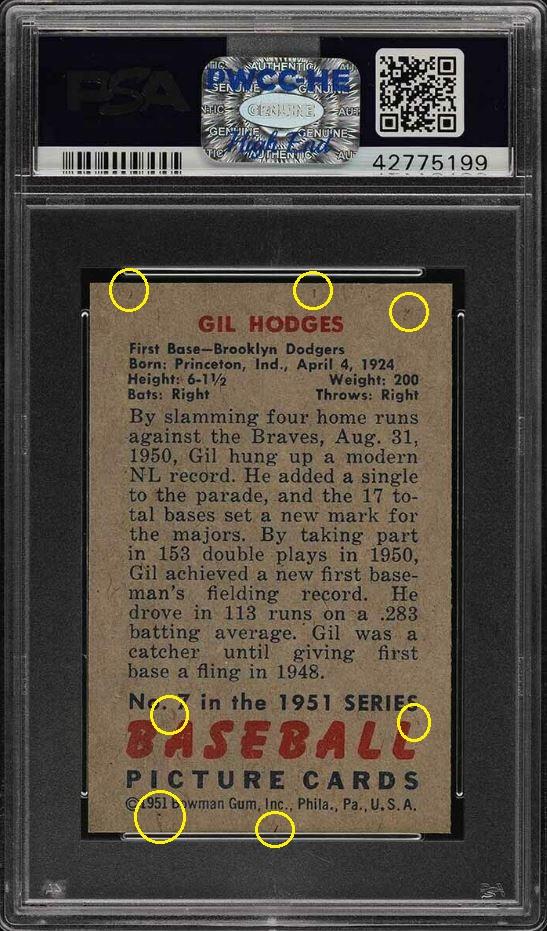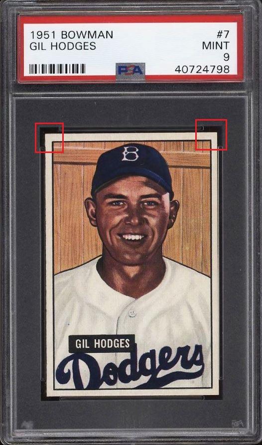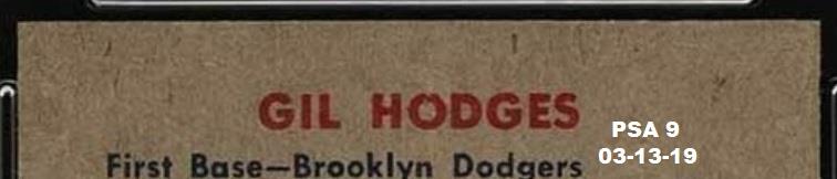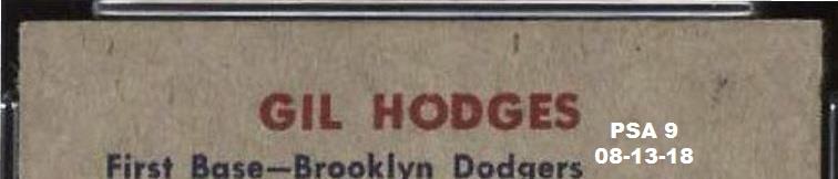 that included the card that started this thread - the 1952 Topps Mantle. This Hodges card cert number is just two numbers before the Mantle. I have also added the PWCC listing descriptions of the card for each sale. ![]() ![]() PSA 9 to PSA 9 PSA Cert #42775199 1951 Bowman Gil Hodges #7 Value gain of $424.16 PSA Set Registry: Andy's '51 Bowman Bums This card was purchased by Gary Moser (whitman111) from Ebay seller PWCC as a PSA 9 on August 13, 2018 for $2,315.84. Same card was sold by PWCC as a PSA 9 for $2,740.00 on March 13, 2019. Yellow circles are print, chipping, stain or fiber identifiers. Red boxes identify corner work. ![]() ![]() ![]() ![]() ![]()