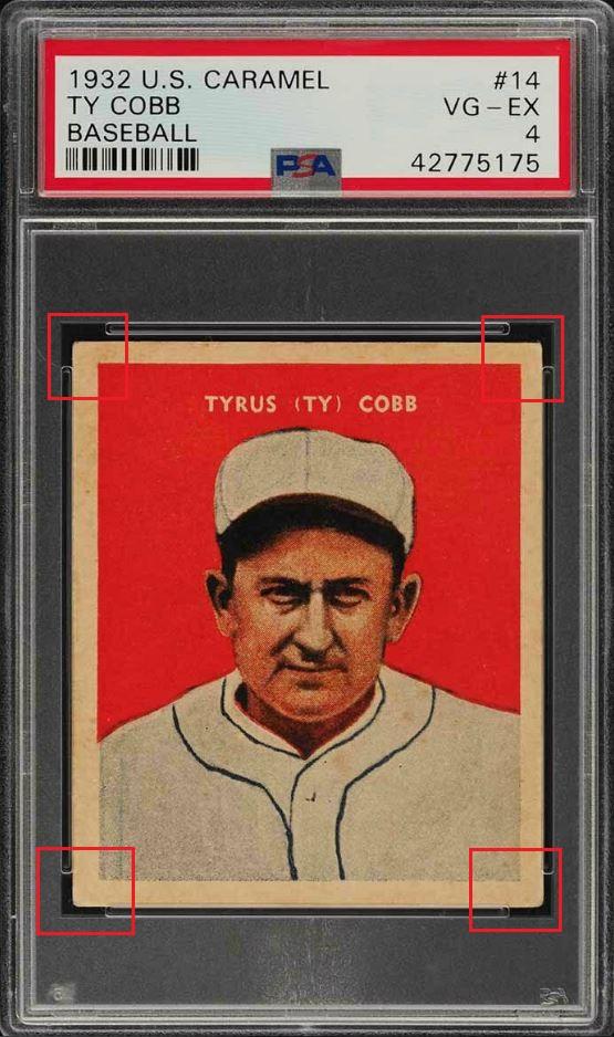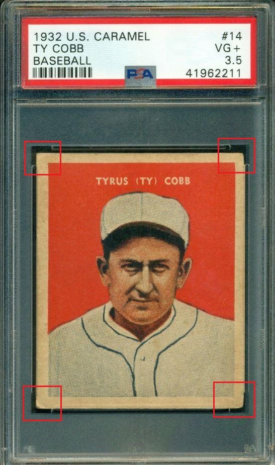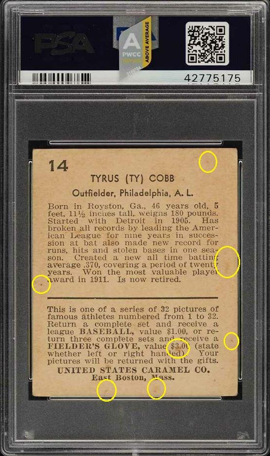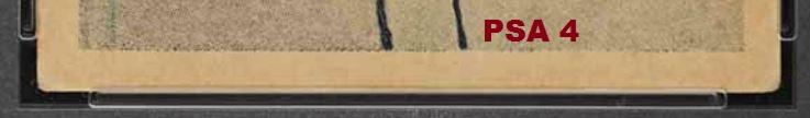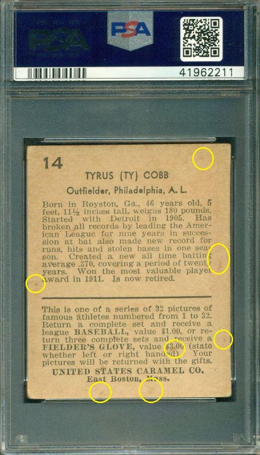 that included the card that started this thread - the 1952 Topps Mantle. This Cobb card cert number is just 26 numbers before the Mantle. The purchase was made buy an unknown (to me) masked buyer ID of 1***a. One of the 'Buyers Club' members? ![]() PSA 3.5 to PSA 4 PSA Cert #42775175 1932 U.S. Caramel Ty Cobb #14 Value gain of $237.00 PSA Set Registry: None found This card was purchased by an unknown buyer (1***a) from Ebay seller ppgustafson as a PSA 3.5 on November 18, 2018 for $2,100.00. Same card was sold by PWCC as a PSA 4 for $2,337.00 on August 11, 2019. Yellow circles are print, chipping, stain or fiber identifiers. Red boxes identify corner work, pressed out creases/wrinkles. ![]() ![]() ![]() ![]() ![]() ![]() ![]()