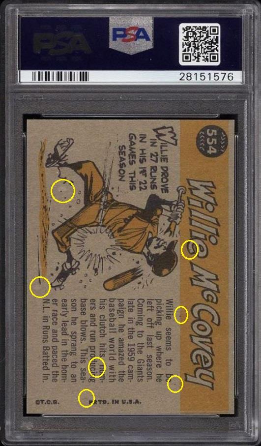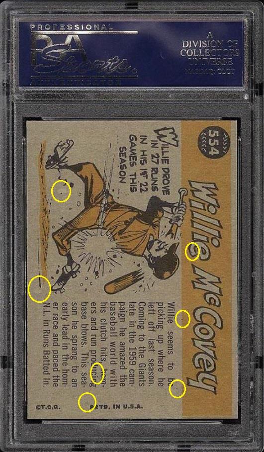 ![]() PSA Cert #28151576 1960 Topps Willie McCovey #554 All-Star Value gain of $5,777.01 PSA Set Registry: Private This card was purchased by Gary Moser (whitman111) from Ebay seller PWCC as a PSA 9 on April 13, 2017 for $988.99. Same card was sold by PWCC as a PSA 10 for $6,766.00 on December 11, 2017. Yellow circles are print, chipping, stain or fiber identifiers. Red boxes identify color added to red ink imperfections (fisheyes/hickies). ![]() ![]() ![]() ![]() ![]()
