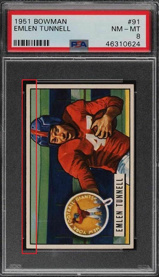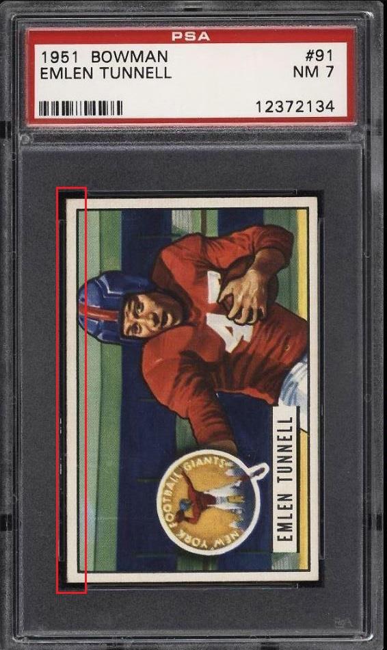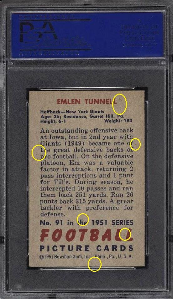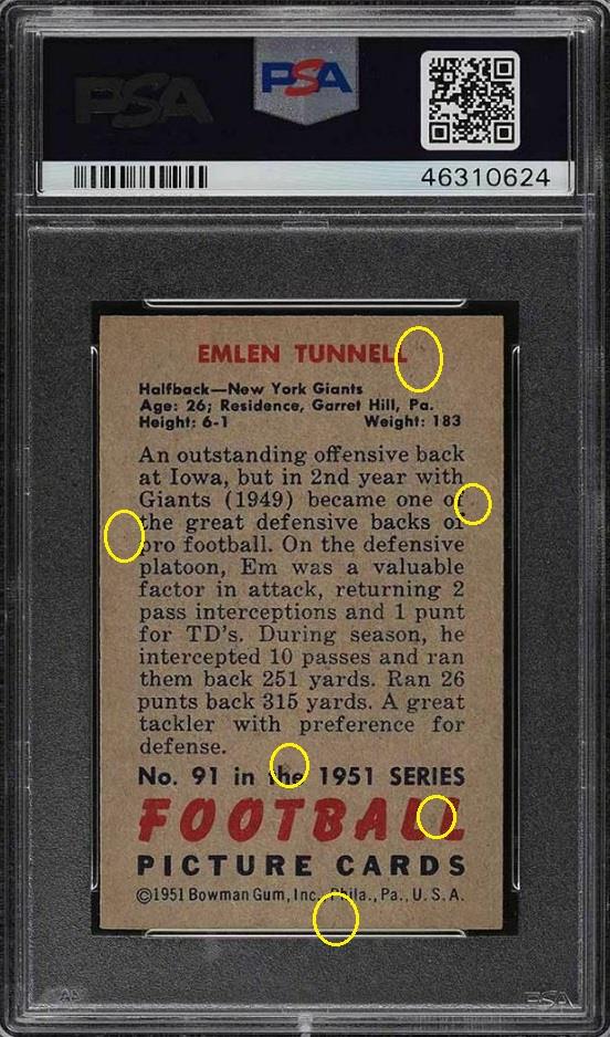 PSA Cert #46310624 1951 Bowman Emlen Tunnell #91 Value gain of $428.66 PSA Set Registry: none found Card was sold again in May of 2022. ![]() This card was purchased by Gary Moser (whitman111) from Ebay seller PWCC as a PSA 7 on July 22, 2018 for $138.34. Same card was sold by PWCC as a PSA 8 for $567.00 on July 26, 2020. Yellow circles are print, chipping, stain or fiber identifiers. Red box identifies trimmed left edge (as viewed). ![]() ![]() ![]() ![]() ![]() ![]()