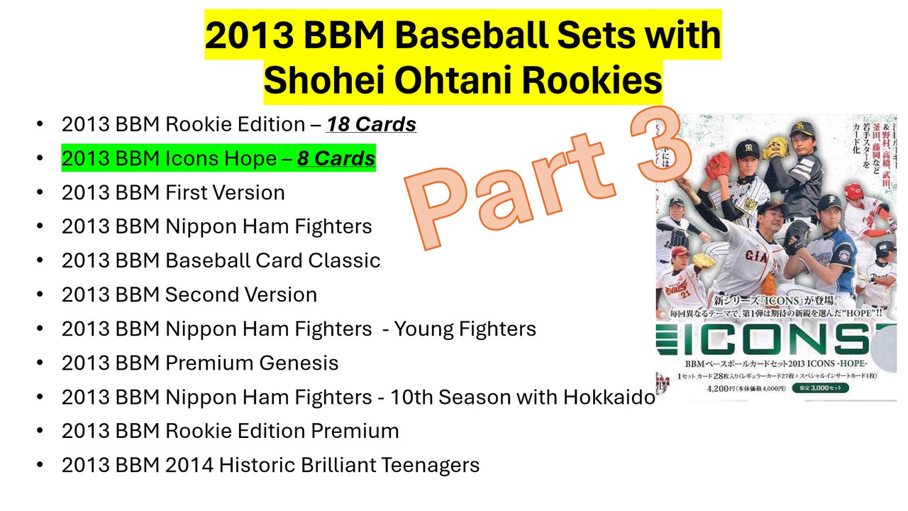 Part 3 on YouTube in my 2013 Japanese BBM Shohei Ohtani Rookie Card Videos. Here are the 8 cards in the 2013 BBM Icons Hope.