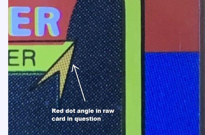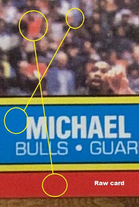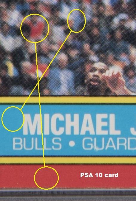 When these cards were printed in 1986, 4 color process film files were used to make the plate images. Most likely 150 line screen was used and being 4 color process utilizing halftone dots, each color would have used a different screen angle to prevent moire patterns. In the below images, I used a white arrow line to show the direction of the red dot angle. All three PSA 10 examples have the same screen angle which is 75 degrees). The raw card in question is at an entirely different angle. The different line screen angle used in the card in question raises a red flag. ![]() ![]() ![]() ![]() The second point of interest is the discrepancy of color between one of the PSA 10s and the raw card. The raw card has a very vibrant red border and blue nameplate, yet washed out flat red and blue in the internal game action image (circled areas below). The color density should be pretty consistent (as in the PSA 10 card circled below). ![]() ![]() Hope this helps.