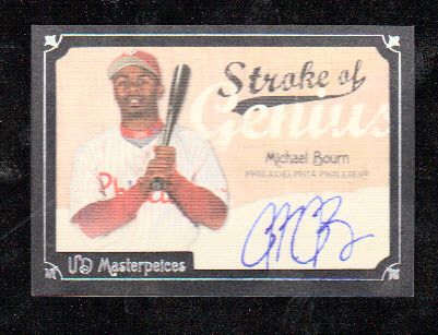 Confirmed to you.... 2007 UD Masterpieces Michael Bourn Stroke of Genius autograph card - $3.00  Most prices dropped for all available, will be adding a few more tonight as well. | ||
