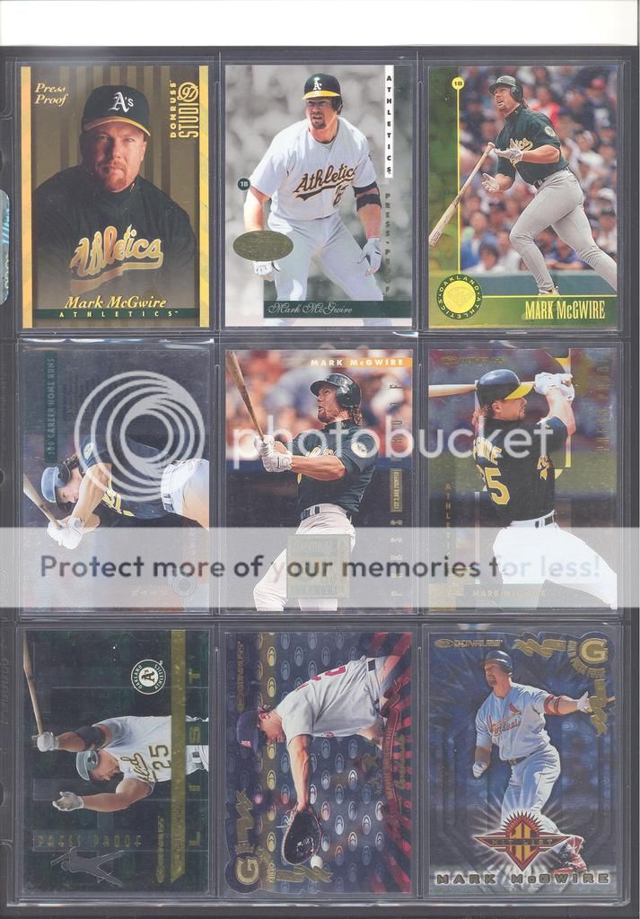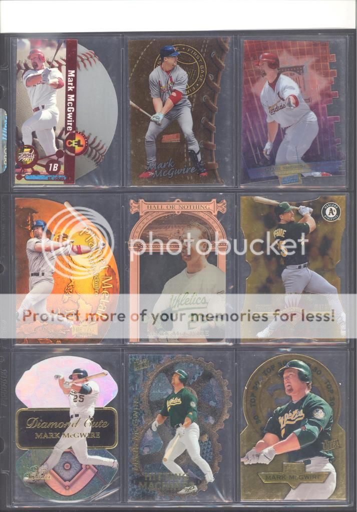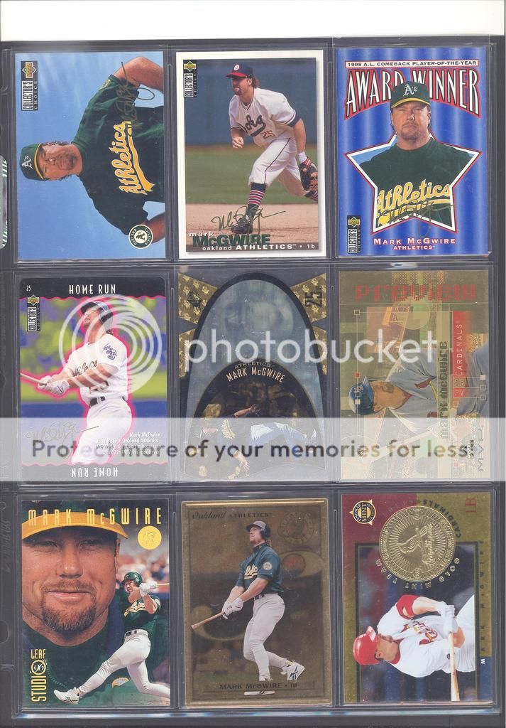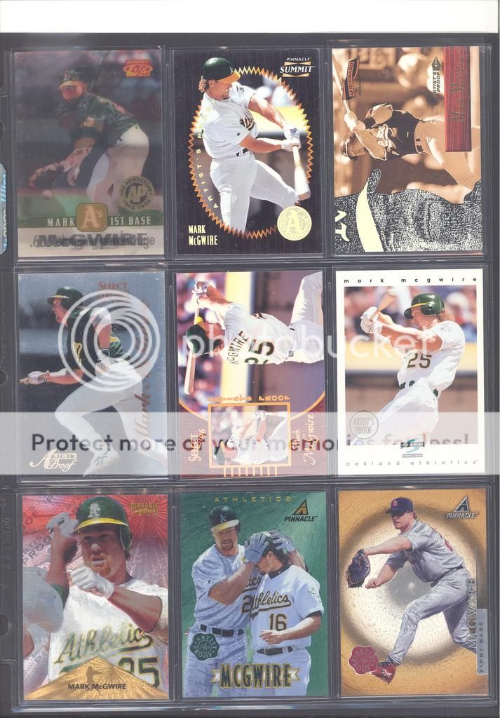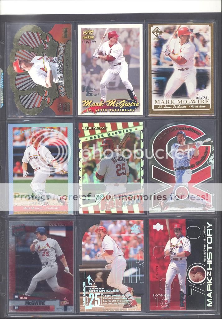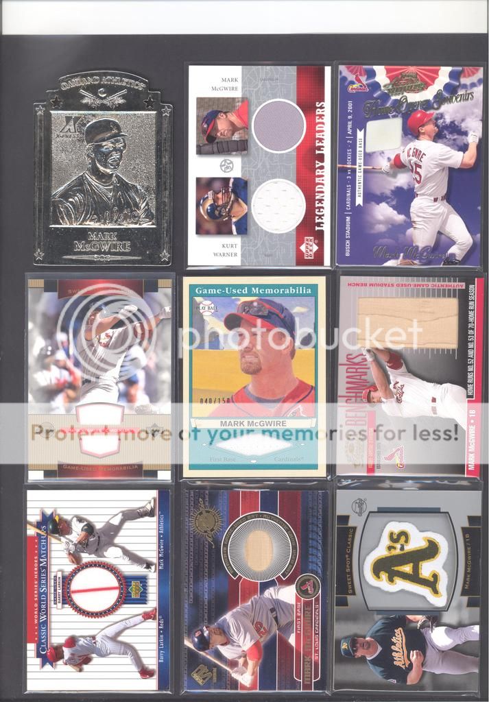 I have been collecting McGwire cards for many years now and have amassed a fun collection of over 4,500 unique cards. My focus has been mostly cards and game used in particular, although I inevitability wound up with a bunch of other stuff too (a bat, balls, posters, pictures, coins, and so on). Along with these other non-card items, I have amassed quite a mini collection of duplicates. I honestly don't do a whole lot of selling, so I just keep piling them up. It's time to pass these along to other McGwire collectors (or insert/set collectors) who will appreciate them. My preference would be to trade these cards for other McGwires I am missing. Ultimately, if I cannot find someone to trade with, they could be sold too. Anyways, to the scans!! Oh and FYI, I only collect cards through 2004, a little after he retired and they stopped producing new cards of his....for a while at least. I can't possibly keep up with the new stuff, so I drew the line at 2004. I don't have a trade list necessarily as there are still darn near 1,000 cards I still "need" on my list. I happen to keep track of my cards on Joe's onionring website - onionring9's Mark McGwire List (Viewing onionring9) (I know he has a new site, I just like the old one). For those who haven't seen it before, it is pretty user friendly. My collection can be viewed by chosing the user "delsant2" from the drop down. The rest should be easy. Ok, for real this time...to the scans! 1998 Pinnacle Epix. Ohhh, so pretty. ![]() A sample of some lower serial numbered stuff. ![]() Random assortment. Middle left is a 2002 Topps 206 card, Cycle Brand variation in a white Cardinals uniform ![]() Sample of refactors. ![]() Another random assortment. Bottom middle is the gold foil version (MUCH more rare) ![]() Some random Pacific stuff. Middle middle is a 2000 Crwon Royale Proof. Kinda hard to see in the scan. It's a VERY thin card made on what almost seems to be a film. Bottom middle is a 1997 Pacific Collection - Silver foil. Looks kinda blue in the picture, but in person I am nearly positive it is silver. Bottom right is a 1998 Pacific Collection - Platinum Blue. ![]() Tiffanys and other random cards. ![]() Heres some pretty good stuff! Ever see one of those SPx Radiance Trade cards? Top middle is a 1997 Select - Tools of the Trade - Mirror Blue w/Frank Thomas Middle left is a 1997 SPx - Force Autograph numbered /100 (Albert Belle auto) ![]() Gold signatures, gold stuff. ![]() A sample of some press proofs. ![]() A sample of some "middle of the road" serial numbered stuff. ![]() Fun couple groups of three. ![]() Assortment of mid-level die cuts. ![]() A sample of some artist's proofs. ![]() Promos/Samples/Pre-Productions The cards with the backs facing out are: 1998 Topps Tek Pre-Production 1996 Leaf Preferred Steel Silver Promo 2001 Donruss Class of 2001 Silver Sample 1998 Donruss Preferred - Great X-Pectations Sample (w/Tony Clark) 1998 Donruss Elite - Prime Numbers Sample #3b 1998 Leaf - Heading to the Hall Sample ![]() Some higher print run serial numbered cards. ![]() These are cool! Some oddball/errors. Some are pretty darn hard to find!! A 1988 Star Company blank back promo Two variations of the 1986 BK Huntsville Stars card 1989 Upper Deck hologram variation (hologram has NO ball background) 1995 UD Collector's Choice Crash the Game All-Star 1997 Score - Hobby Reserve...but note the number HR511. Most of these hobby reserve cards came in premium card stock with only 511 on the back, not HR511 1991 Stadium Club - no foil error 1990 Classic - Bo, Rubin, Mark error (card should say AL fence busters) Here's my favorite. A 2000 Skybox - Skylines Star Rubies error. Notice the foil of the skyline (reddish middle portion of the card) is shiny and refractor-like, just like the SR version, except it lacks the red foil and serial numbering. I thought this was pretty cool anyways. ![]() Three Ultra Diamond Producer cards, three 1998 Prized Collection cards, three other Pacific die cuts. ![]() All the game used duplicates I have here...and one 1997 Pinnacle Xpress - Metal Works Silver /400 (also have the bronze not pictured) ![]() Do let me know if there is anything of interest to you and if you can trade or just want to buy. Again, my preference would be to trade, but I am open to alternatives. Any questions, feel free to ask...here or via PM. FWIW, I have A LOT more duplicates. This is just a sampling of what I have. Some other high-end not pictured, plenty of mid-level stuff not pictured and WAY too many lower level $5-$20 inserts that I haven't bothered to take pictures of. Oh yes, and of course, I have base cards, ha! Probably have over 100 1990 Fleer cards if anyone is interested. Heard they are REALLY valuable!!! What do they say....oh yeah, "my loss, your gain" or "a great investment lot"! Yeah, anyway, so there is plenty more good cards, so if you are interested, I can take more scans/pictures. Thanks and enjoy! Regards, Mark