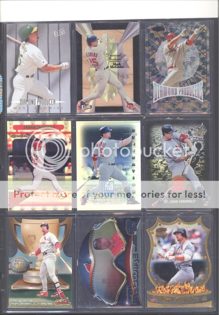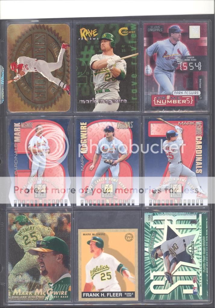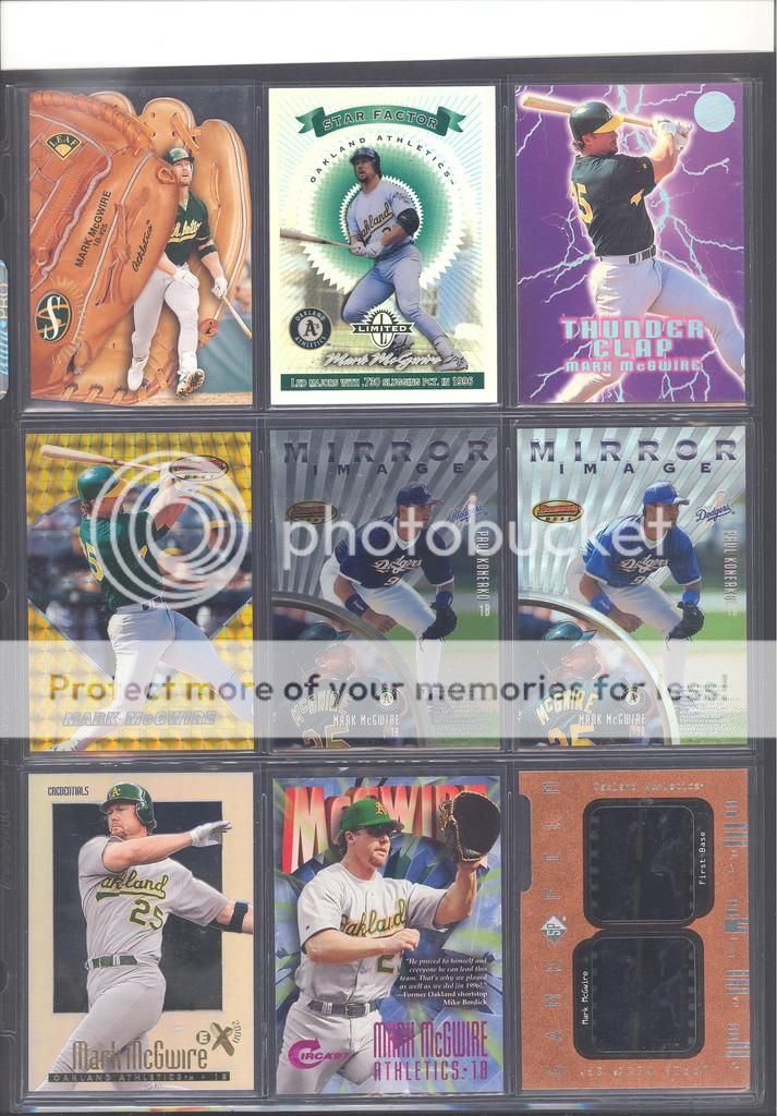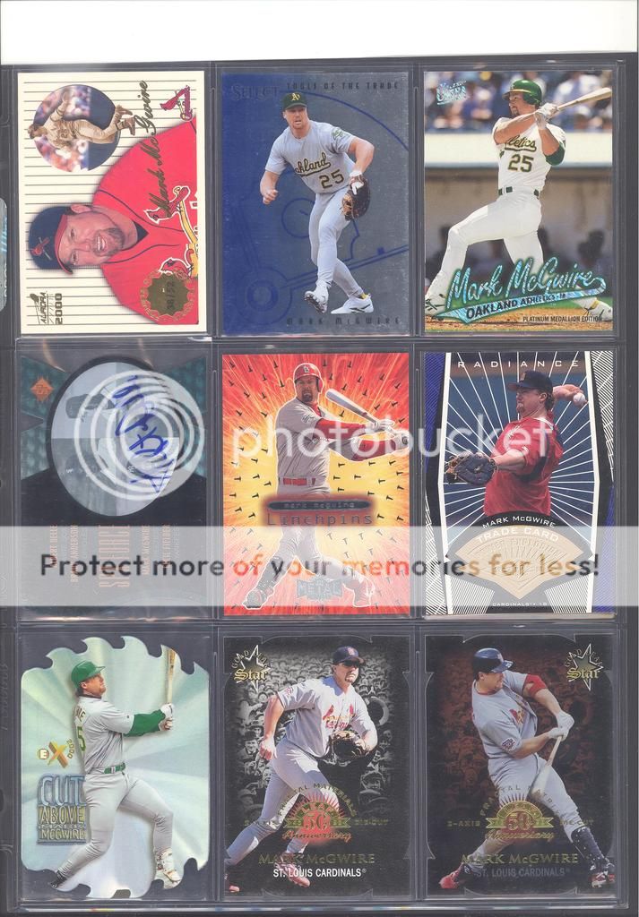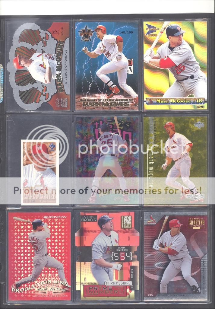 I have been collecting McGwire cards for many years now and have amassed a fun collection of over 4,500 unique cards. My focus has been mostly cards and game used in particular, although I inevitability wound up with a bunch of other stuff too (a bat, balls, posters, pictures, coins, and so on). Along with these other non-card items, I have amassed quite a mini collection of duplicates. I honestly don't do a whole lot of selling, so I just keep piling them up. It's time to pass these along to other McGwire collectors (or insert/set collectors) who will appreciate them. My preference would be to trade these cards for other McGwires I am missing. Ultimately, if I cannot find someone to trade with, they could be sold too. Anyways, to the scans!! Oh and FYI, I only collect cards through 2004, a little after he retired and they stopped producing new cards of his....for a while at least. I can't possibly keep up with the new stuff, so I drew the line at 2004. I don't have a trade list necessarily as there are still darn near 1,000 cards I still "need" on my list. I happen to keep track of my cards on Joe's onionring website - onionring9's Mark McGwire List (Viewing onionring9) (I know he has a new site, I just like the old one). For those who haven't seen it before, it is pretty user friendly. My collection can be viewed by chosing the user "delsant2" from the drop down. The rest should be easy. Ok, for real this time...to the scans! 1998 Pinnacle Epix. Ohhh, so pretty. ![]() A sample of some lower serial numbered stuff. ![]() Random assortment. Middle left is a 2002 Topps 206 card, Cycle Brand variation in a white Cardinals uniform ![]() Sample of refactors. ![]() Another random assortment. Bottom middle is the gold foil version (MUCH more rare) ![]() Some random Pacific stuff. Middle middle is a 2000 Crwon Royale Proof. Kinda hard to see in the scan. It's a VERY thin card made on what almost seems to be a film. Bottom middle is a 1997 Pacific Collection - Silver foil. Looks kinda blue in the picture, but in person I am nearly positive it is silver. Bottom right is a 1998 Pacific Collection - Platinum Blue. ![]() Tiffanys and other random cards. ![]() Heres some pretty good stuff! Ever see one of those SPx Radiance Trade cards? Top middle is a 1997 Select - Tools of the Trade - Mirror Blue w/Frank Thomas Middle left is a 1997 SPx - Force Autograph numbered /100 (Albert Belle auto) ![]() Gold signatures, gold stuff. ![]() A sample of some press proofs. ![]() A sample of some "middle of the road" serial numbered stuff. ![]() Fun couple groups of three. ![]() Assortment of mid-level die cuts. ![]() A sample of some artist's proofs. ![]() Promos/Samples/Pre-Productions The cards with the backs facing out are: 1998 Topps Tek Pre-Production 1996 Leaf Preferred Steel Silver Promo 2001 Donruss Class of 2001 Silver Sample 1998 Donruss Preferred - Great X-Pectations Sample (w/Tony Clark) 1998 Donruss Elite - Prime Numbers Sample #3b 1998 Leaf - Heading to the Hall Sample ![]() Some higher print run serial numbered cards. ![]() These are cool! Some oddball/errors. Some are pretty darn hard to find!! A 1988 Star Company blank back promo Two variations of the 1986 BK Huntsville Stars card 1989 Upper Deck hologram variation (hologram has NO ball background) 1995 UD Collector's Choice Crash the Game All-Star 1997 Score - Hobby Reserve...but note the number HR511. Most of these hobby reserve cards came in premium card stock with only 511 on the back, not HR511 1991 Stadium Club - no foil error 1990 Classic - Bo, Rubin, Mark error (card should say AL fence busters) Here's my favorite. A 2000 Skybox - Skylines Star Rubies error. Notice the foil of the skyline (reddish middle portion of the card) is shiny and refractor-like, just like the SR version, except it lacks the red foil and serial numbering. I thought this was pretty cool anyways. ![]() Three Ultra Diamond Producer cards, three 1998 Prized Collection cards, three other Pacific die cuts. ![]() All the game used duplicates I have here...and one 1997 Pinnacle Xpress - Metal Works Silver /400 (also have the bronze not pictured) ![]() Do let me know if there is anything of interest to you and if you can trade or just want to buy. Again, my preference would be to trade, but I am open to alternatives. Any questions, feel free to ask...here or via PM. FWIW, I have A LOT more duplicates. This is just a sampling of what I have. Some other high-end not pictured, plenty of mid-level stuff not pictured and WAY too many lower level $5-$20 inserts that I haven't bothered to take pictures of. Oh yes, and of course, I have base cards, ha! Probably have over 100 1990 Fleer cards if anyone is interested. Heard they are REALLY valuable!!! What do they say....oh yeah, "my loss, your gain" or "a great investment lot"! Yeah, anyway, so there is plenty more good cards, so if you are interested, I can take more scans/pictures. Thanks and enjoy! Regards, Mark