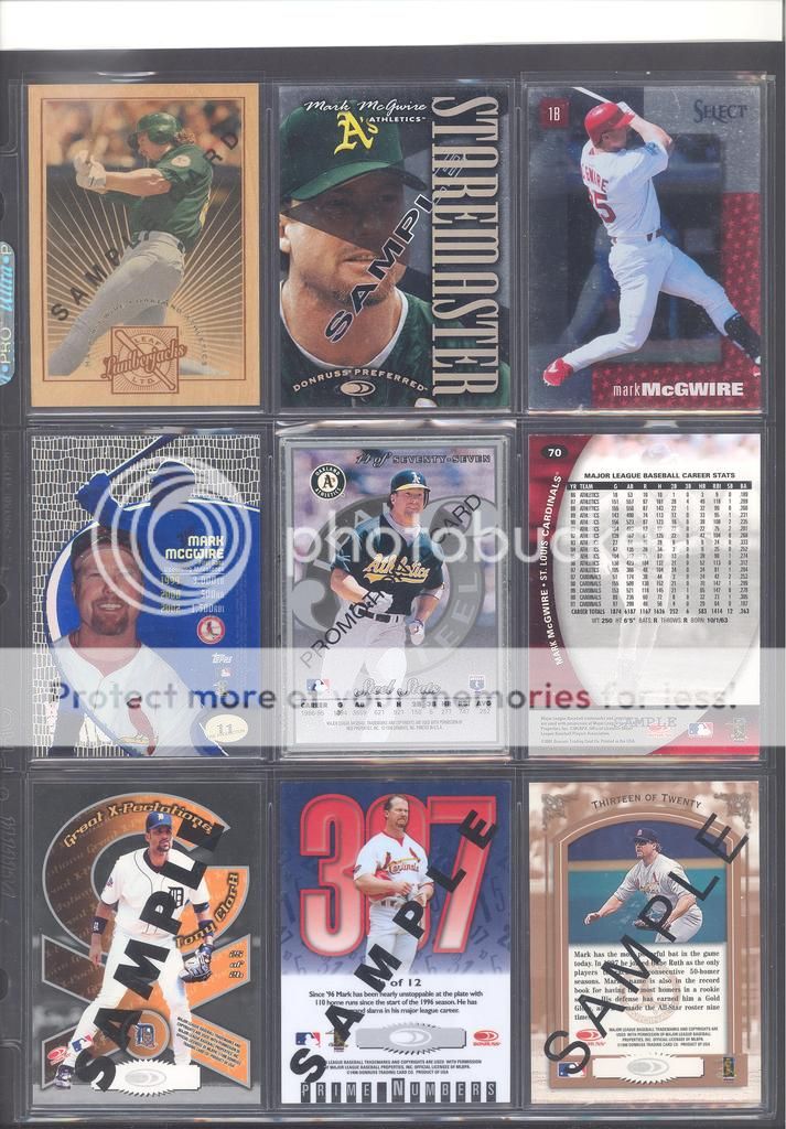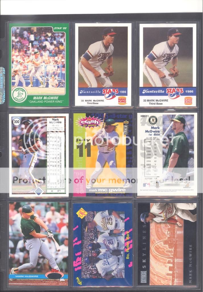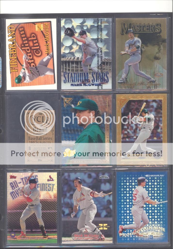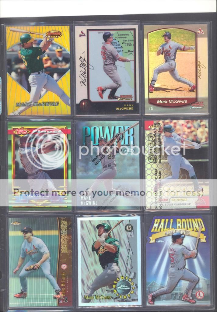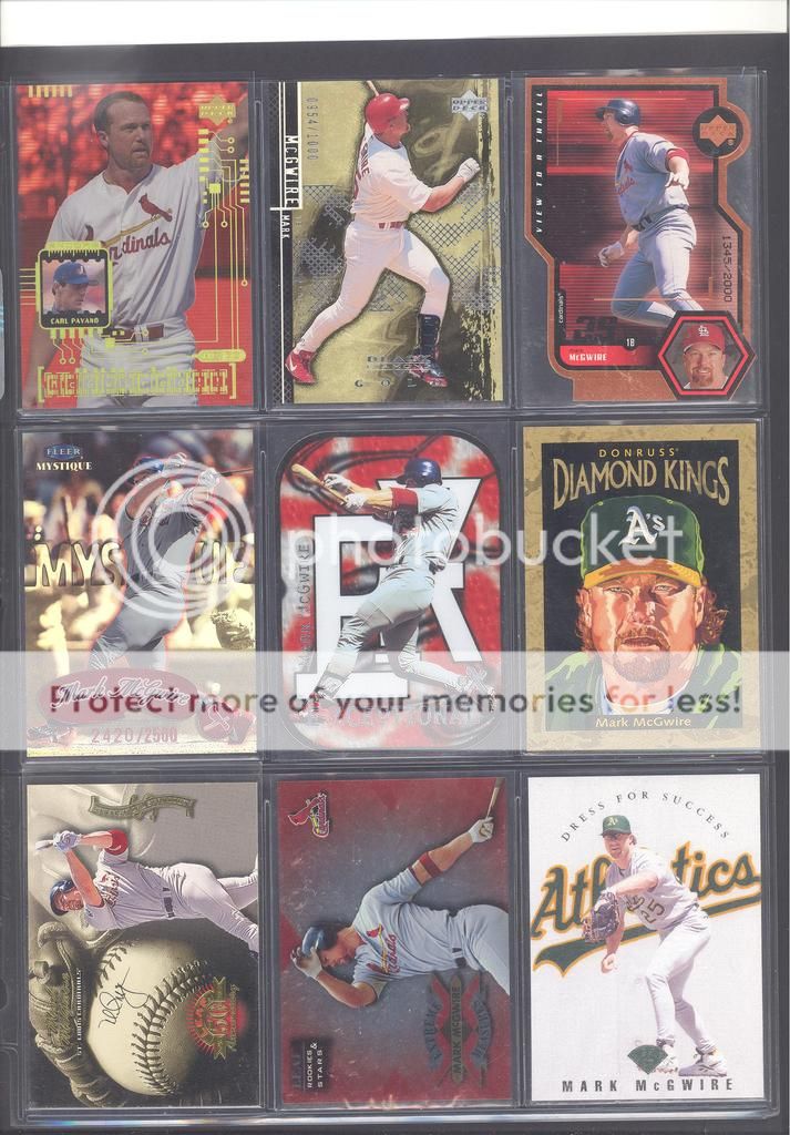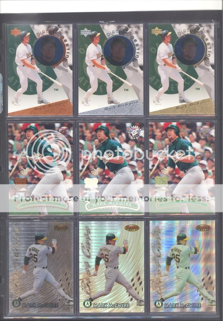 I have been collecting McGwire cards for many years now and have amassed a fun collection of over 4,500 unique cards. My focus has been mostly cards and game used in particular, although I inevitability wound up with a bunch of other stuff too (a bat, balls, posters, pictures, coins, and so on). Along with these other non-card items, I have amassed quite a mini collection of duplicates. I honestly don't do a whole lot of selling, so I just keep piling them up. It's time to pass these along to other McGwire collectors (or insert/set collectors) who will appreciate them. My preference would be to trade these cards for other McGwires I am missing. Ultimately, if I cannot find someone to trade with, they could be sold too. Anyways, to the scans!! Oh and FYI, I only collect cards through 2004, a little after he retired and they stopped producing new cards of his....for a while at least. I can't possibly keep up with the new stuff, so I drew the line at 2004. I don't have a trade list necessarily as there are still darn near 1,000 cards I still "need" on my list. I happen to keep track of my cards on Joe's onionring website - onionring9's Mark McGwire List (Viewing onionring9) (I know he has a new site, I just like the old one). For those who haven't seen it before, it is pretty user friendly. My collection can be viewed by chosing the user "delsant2" from the drop down. The rest should be easy. Ok, for real this time...to the scans! 1998 Pinnacle Epix. Ohhh, so pretty. ![]() A sample of some lower serial numbered stuff. ![]() Random assortment. Middle left is a 2002 Topps 206 card, Cycle Brand variation in a white Cardinals uniform ![]() Sample of refactors. ![]() Another random assortment. Bottom middle is the gold foil version (MUCH more rare) ![]() Some random Pacific stuff. Middle middle is a 2000 Crwon Royale Proof. Kinda hard to see in the scan. It's a VERY thin card made on what almost seems to be a film. Bottom middle is a 1997 Pacific Collection - Silver foil. Looks kinda blue in the picture, but in person I am nearly positive it is silver. Bottom right is a 1998 Pacific Collection - Platinum Blue. ![]() Tiffanys and other random cards. ![]() Heres some pretty good stuff! Ever see one of those SPx Radiance Trade cards? Top middle is a 1997 Select - Tools of the Trade - Mirror Blue w/Frank Thomas Middle left is a 1997 SPx - Force Autograph numbered /100 (Albert Belle auto) ![]() Gold signatures, gold stuff. ![]() A sample of some press proofs. ![]() A sample of some "middle of the road" serial numbered stuff. ![]() Fun couple groups of three. ![]() Assortment of mid-level die cuts. ![]() A sample of some artist's proofs. ![]() Promos/Samples/Pre-Productions The cards with the backs facing out are: 1998 Topps Tek Pre-Production 1996 Leaf Preferred Steel Silver Promo 2001 Donruss Class of 2001 Silver Sample 1998 Donruss Preferred - Great X-Pectations Sample (w/Tony Clark) 1998 Donruss Elite - Prime Numbers Sample #3b 1998 Leaf - Heading to the Hall Sample ![]() Some higher print run serial numbered cards. ![]() These are cool! Some oddball/errors. Some are pretty darn hard to find!! A 1988 Star Company blank back promo Two variations of the 1986 BK Huntsville Stars card 1989 Upper Deck hologram variation (hologram has NO ball background) 1995 UD Collector's Choice Crash the Game All-Star 1997 Score - Hobby Reserve...but note the number HR511. Most of these hobby reserve cards came in premium card stock with only 511 on the back, not HR511 1991 Stadium Club - no foil error 1990 Classic - Bo, Rubin, Mark error (card should say AL fence busters) Here's my favorite. A 2000 Skybox - Skylines Star Rubies error. Notice the foil of the skyline (reddish middle portion of the card) is shiny and refractor-like, just like the SR version, except it lacks the red foil and serial numbering. I thought this was pretty cool anyways. ![]() Three Ultra Diamond Producer cards, three 1998 Prized Collection cards, three other Pacific die cuts. ![]() All the game used duplicates I have here...and one 1997 Pinnacle Xpress - Metal Works Silver /400 (also have the bronze not pictured) ![]() Do let me know if there is anything of interest to you and if you can trade or just want to buy. Again, my preference would be to trade, but I am open to alternatives. Any questions, feel free to ask...here or via PM. FWIW, I have A LOT more duplicates. This is just a sampling of what I have. Some other high-end not pictured, plenty of mid-level stuff not pictured and WAY too many lower level $5-$20 inserts that I haven't bothered to take pictures of. Oh yes, and of course, I have base cards, ha! Probably have over 100 1990 Fleer cards if anyone is interested. Heard they are REALLY valuable!!! What do they say....oh yeah, "my loss, your gain" or "a great investment lot"! Yeah, anyway, so there is plenty more good cards, so if you are interested, I can take more scans/pictures. Thanks and enjoy! Regards, Mark