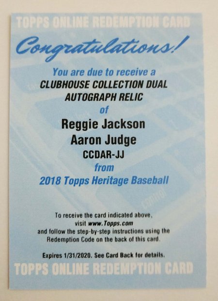 1. Aaron Judge/Reggie Jackson Clubhouse Collection Dual Relic Auto /10 or less (unused redemption): $1250 OBO includes insured overnight shipping with signature confirmation