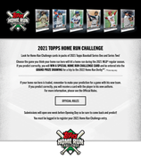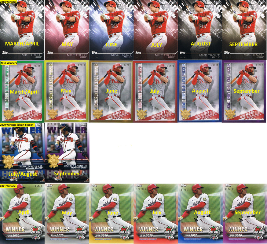 This is the 4th year Topps is running this promotion. For information on prior years contests, see the link(s) below. 2018 Home Run Challenge Thread https://www.blowoutforums.com/showthread.php?t=1199779 2019 Home Run Challenge Thread https://www.blowoutforums.com/showthread.php?t=1271551 2020 Home Run Challenge Thread https://www.blowoutforums.com/showthread.php?t=1348754 Rules of Note: __________________________________ **2021 Topps Home Run Challenge Rules will be posted in the link below** https://www.topps.com/media/pdf/Topp...s2021Final.pdf. * The prize for picking the correct date of a HR is a month specific parallel card. * There are 6 possible parallels, 1 for each month ( April, May, June, July, August, September) * Once a date is picked, Topps will not allow you to change this * If the player does not play that day for any reason (cancelled game or because they sit out) the play is considered a loss. * You only win one parallel card no matter how many home runs that player hits that day. HERE ARE EXAMPLES OF WINNER CARDS FROM PRIOR YEARS ![]() _________________________________________________________________________ The 2021 HR Challenge Checklist HRC-1 Mike Trout HRC-2 Ronald Acuña Jr. HRC-3 Freddie Freeman HRC-4 J.D. Martinez HRC-5 Rafael Devers HRC-6 Javier Baez HRC-7 Kyle Schwarber HRC-8 Eloy Jimenez HRC-9 Francisco Lindor HRC-10 Nolan Arenado HRC-11 Yordan Alvarez HRC-12 Alex Bregman HRC-13 Jorge Soler HRC-14 Mookie Betts HRC-15 Cody Bellinger HRC-16 Christian Yelich HRC-17 Josh Donaldson HRC-18 Pete Alonso HRC-19 Aaron Judge HRC-20 Gleyber Torres HRC-21 Bryce Harper HRC-22 Giancarlo Stanton HRC-23 Fernando Tatis Jr. HRC-24 Paul Goldschmidt HRC-25 Joey Gallo HRC-26 Vladimir Guerrero Jr. HRC-27 Juan Soto HRC-28 Eugenio Suarez HRC-29 Kris Bryant HRC-30 Matt Chapman