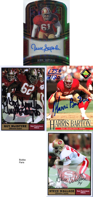 ![]() ![]() ![]() ![]() Both Montanas I got for a really good price due to condition issues. I'm on the hunt for a decent Young. At RB hoping to obtain/upgrade both backups with Pro Line versions. WRs I have an IP/TTM of Rice but I'd like to upgrade it to a certified copy at some point. Mike Wilson will have to be PSA/DNA. At TE I adore the Topps Archives of the Fan Favorites Jones. Uses an actual cardboard back like the good ol' days. Williams I corresponded with a bit over email while he was part of the faculty at Nebraska. Super cool guy! Finally we have the offensive line. 1990 was the only year Barton played Guard in his career (1987-1996) with Steve Wallace, a natural LT, shifted to RT in 1990 for his one year at the spot. When Paris Bubba Paris left, Barton and Wallace resumed their regular positions. |
