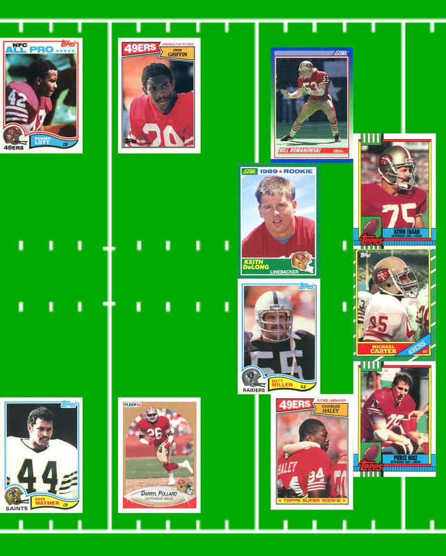 Anyways! I put together a set of rookie cards for all the players on the team with the following stipulations: 1. All cards had to be before 1991 sets. No card later than 1990 to reflect the rosters from the game. 2. All cards had to be NFL rookies. 3. If a player has multiple rookies, I picked the "better" set or the more interesting card. 4. I'm allowed to break my own rules. Here's the roster courtsey of Tecmo Geek - https://tecmogeek.com/teams/49ers/. Pictures are organized by starters (left) and backups (right) as they were listed in the game on offense. ![]() ![]() ![]() ![]() ![]() 1981 Topps Joe Montana, BGS 6.5 (6, 8, 8.5, 8.5) 1986 Topps Steve Young - no USFL for this one 1984 Topps Roger Craig 1988 Topps Tom Rathman 1990 Topps Tiffany Dexter Carter - I opted for this one over the Topps Update in a 49ers uniform. 1984 Topps USFL Harry Sydney - his NFL rookie card was in 1991. 1989 Score John Taylor - his All Pro card later in the set is a better picture but not a rookie card. 1986 Topps Jerry Rice, BGS 7 (8, 6.5, 7.5, 8) got it in a quarter machine. 1988 Topps Mike Wilson 1987 Topps Mike Sherrard 1990 Topps Tiffany Brent Jones - originally drafted by the Steelers! Also my favorite correspondence through my TTM requests, with Jamie Williams and Carl Lee close seconds. 1985 Topps Jamie Williams - he's a super smart dude. 1990 Pro Set Jesse Sapolu 1989 Score Supplemental Guy McIntyre 1989 Score Harris Barton - 1990 was the only season of his 10-year career he was a Guard. 1989 Topps Bubba Paris - the largest OL in 1990, listed at 6'6" and 299 lbs. 1990 Fleer Update Steve Wallace 1989 Pro Set Mike Cofer 1989 NFL Franchise Game Barry Helton - Hope Topps brings back a Topps Total type product. 1990 Topps Tiffany Kevin Fagan 1986 Topps Michael Carter 1990 Topps Tiffany Pierce Holt 1990 Score Bill Romanowski - his '90 Pro Set is cooler but I wanted a '90 Score in here. 1989 Score Keith DeLong 1982 Topps Matt Millen - he drafted HoFer Calvin Johnson. 1987 Topps Charles Haley - always be a 49er first, Cowboy second. 1987 Topps Don Griffin 1990 Fleer Update Darryl Pollard 1982 Topps Ronnie Lott 1982 Topps Dave Waymer - RIP, you'll live forever in the hearts of Saints fans of a certain age and TSB fans. |