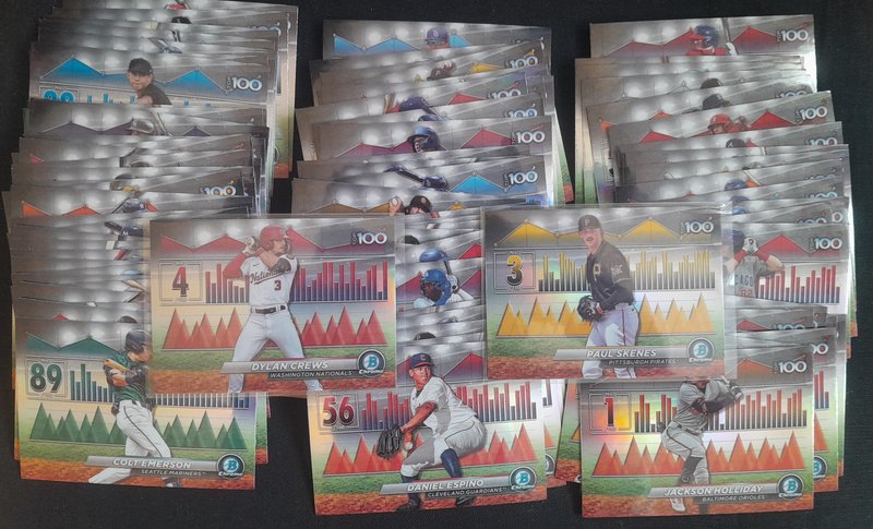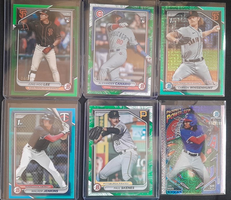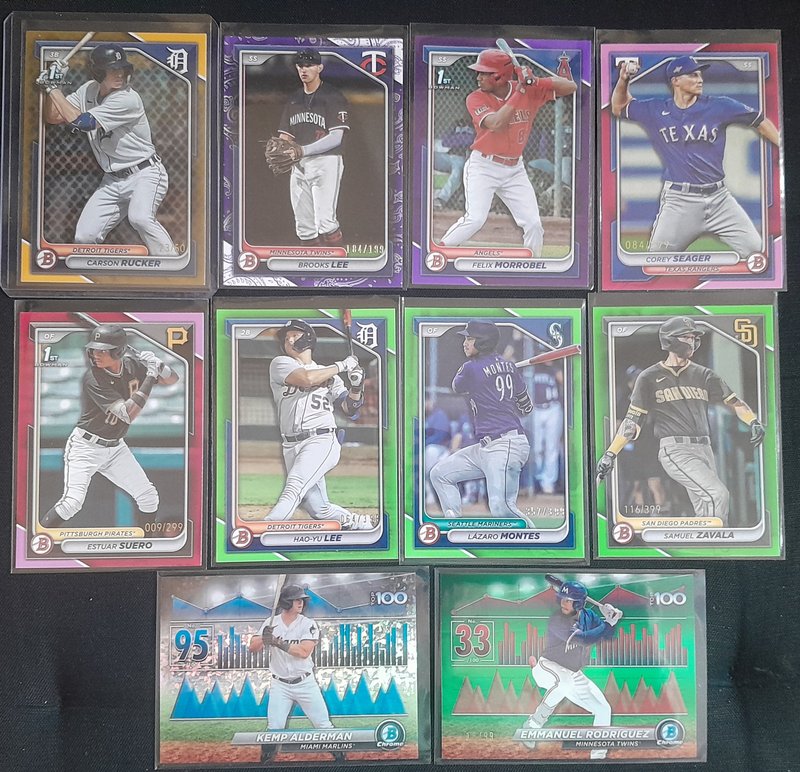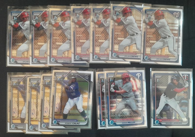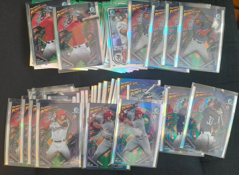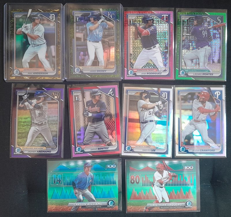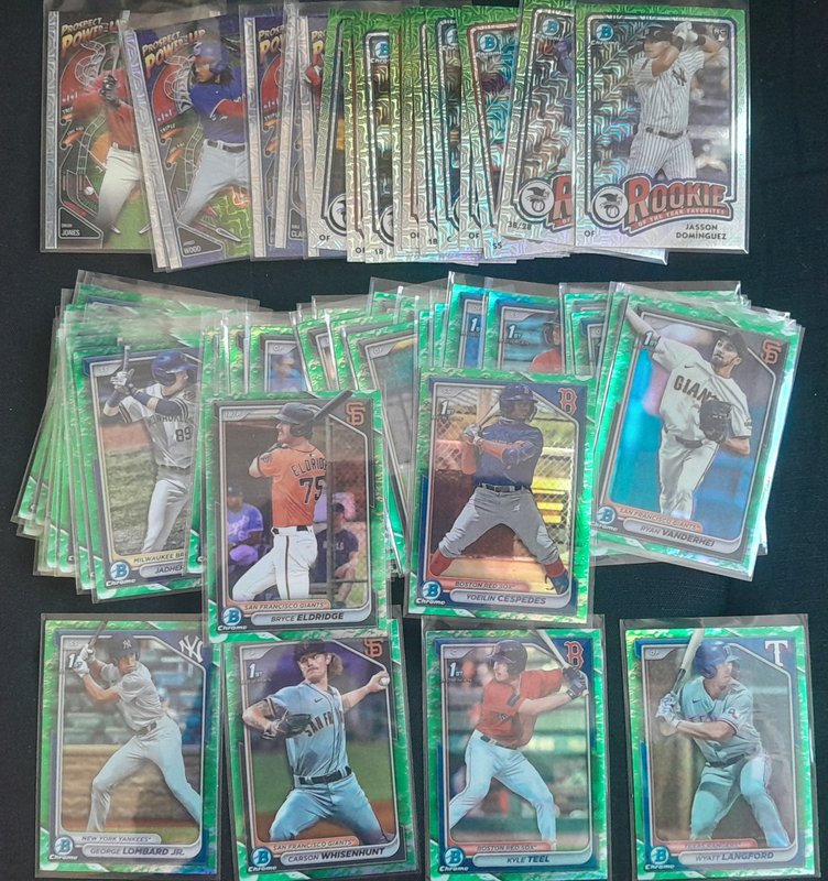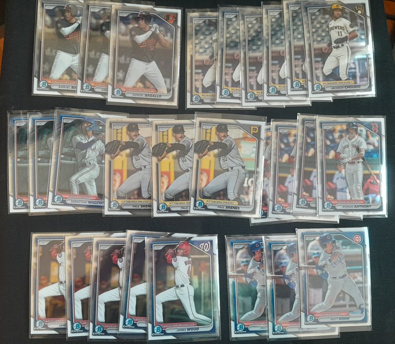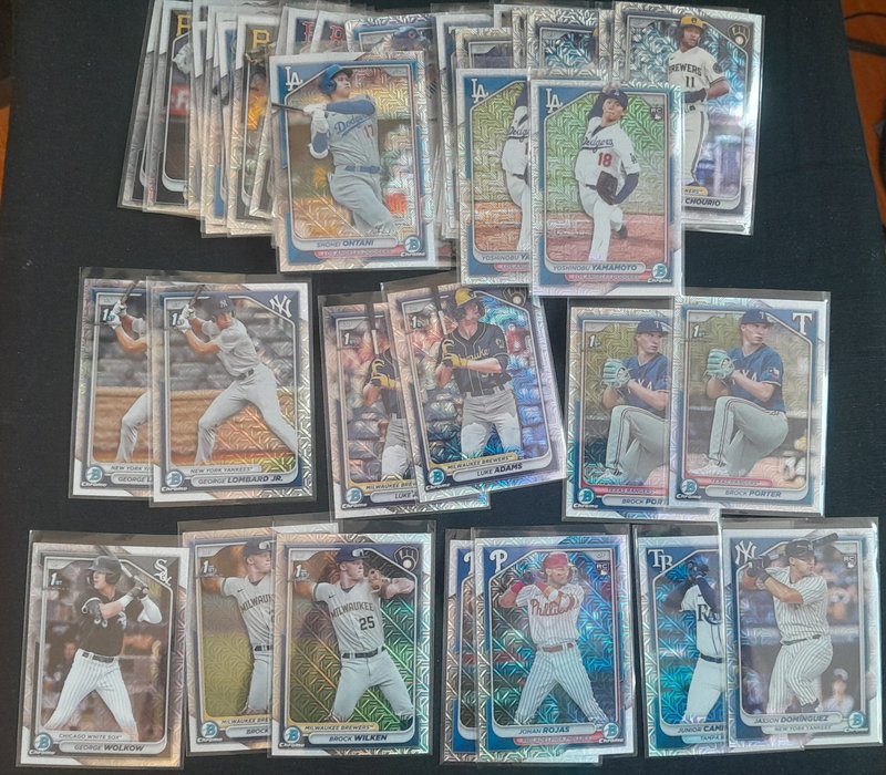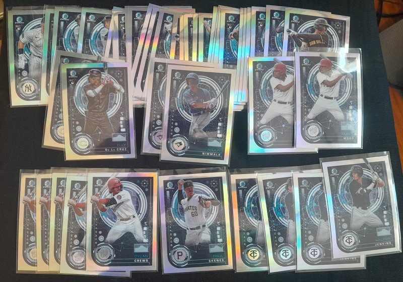 599 DLVD for all of this. Knocked off a lot and added all the NPB. If anyone resells, this should be great for you. Everything I pulled is here (I'd have taken out the Skenes/99, for instance, if I was keeping anything) See pics and details. -2400 Paper Base -175 Chrome 1st Base -392 Regular Chrome -98 Mega total (32 are 1st) -52 Chrome parallel -5 Mega parallel -12 Paper parallel -82 Top 100 -43 Prospect Power Up -43 Bowman AI -43 ROY -18 Mega inserts -6 autos ![]() ![]() ![]() ![]() ![]() ![]() ![]() ![]() ![]() ![]() ![]() ![]() ![]() ![]() Before anyone gets excited about the packs, please just know that it's 22 of the MEGA packs: just base cards. If it's a big deal that those are sealed, Mods, please just let me know and I'll rip them and just add them to the lot.