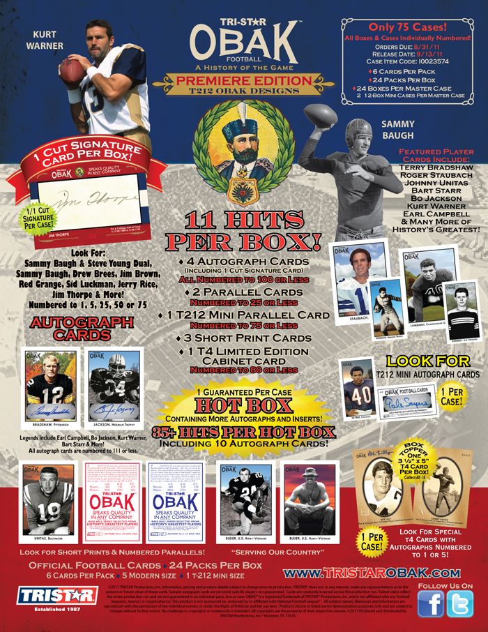 Please click the links below to purchase this product by the Box or Case CASE Coming Soon... BOX Coming Soon... 2011 Tristar Obak Football: Premier Edition 2011 HIGHLIGHTS - 4 AUTOS PER BOX (1 AUTO WILL BE A CUT SIGNATURE CARD) Many Cut Signature products are twice the cost of this product. - ONE 1 OF 1 CUT SIGNATURE PER CASE - 1 HOT BOX PER CASE (Will include 10 autograph cards) - 1 AUTOGRAPHED BOX TOPPER PER CASE - 1 AUTOGRAPHED MINI CARD PER CASE (Tristar’s first autographed Mini Cards) - ONLY 75 NUMBERED CASES BEING PRODUCED (THIS IS A 40% REDUCTION FROM 2010)