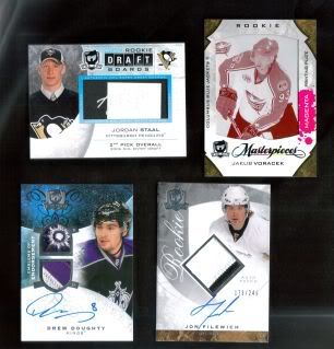 Enjoy Wish the shop had more !! ![]() 1st card Base Paul Stastny /249 2nd card Joe Filewich rookie patch auto /249 3 colors barely 3rd card Drew Doughty auto patch /15 emblems of endorsement sick 4th card Jordan Staal draft boards auto not numbered ? ud site says /25 its like a half inch thick lol ![]() 5th card Jakub Voracek rookie printing plate 1/1 ![]() on ebay tonight pm me if any one interested before they go on !! |