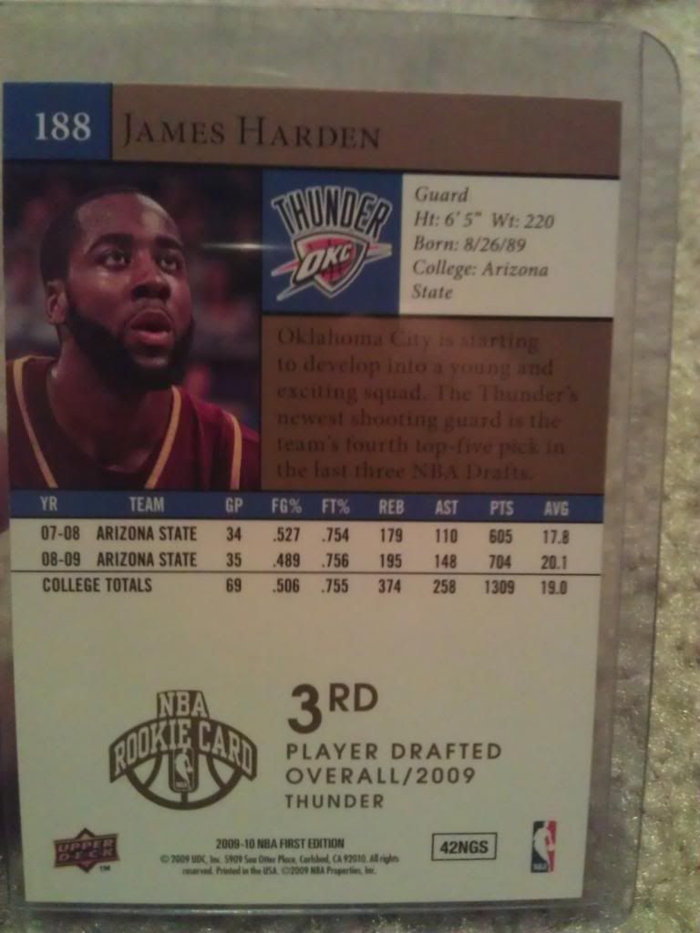 I've been looking at the price for my 09-10 Upper Deck First Edition James Harden Star Rookies Card #188. I've seen on sites that the reg. silver one is worth ~$1-$2 and the gold one is worth around $25-$30 (graded) (Noob question) But do u guys know if there is a bronze edition for that card or only silver and gold? cause the card i have seems to be the gold one which is worth alot more than the silver/regular #188 card. Just wanna be sure that there's no bronze card and that i have the "gold" edition for that card. [front side of my card scanned but rear is a snapshot] ![]()