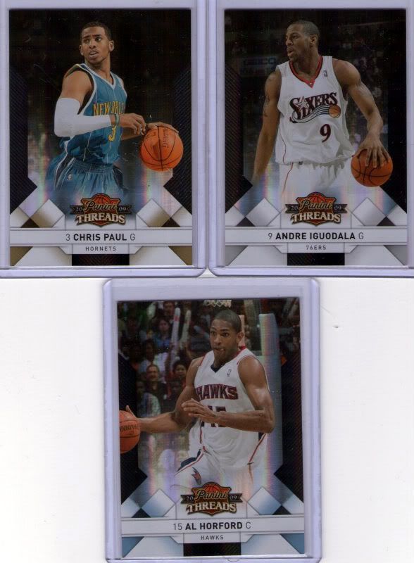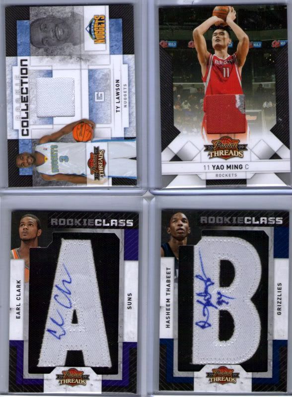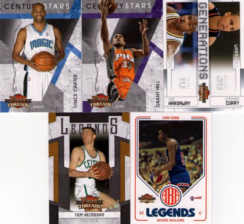 2 Century Stars inserts, Vince Carter & Grant Hill; Generations insert, Stephen Curry/Tim Hardaway; Legends insert, Tom Hensohn; ABA Legends insert, Moses Malone; 8 Team Threads inserts, Joe Johnson, Shaquuille O'Neal, Dwight Howard, Jermaine O'Neal x2 (Home & Away), Elton Brand, Antawn Jamison & Amare Stoudemire; 3 numbered foil refractor type cards,Andre Iguodala #141/249, Chris Paul #56/99 & Al Horford #12/25; Game-worn Swatch, Yao Ming #3/100; Rookie Collection game-worn swatch, Ty Lawson #74/250; 2 Rookie Class AU Letter Patch, Earl Clark #393/625 & Hasheem Thabeet #123/315.
