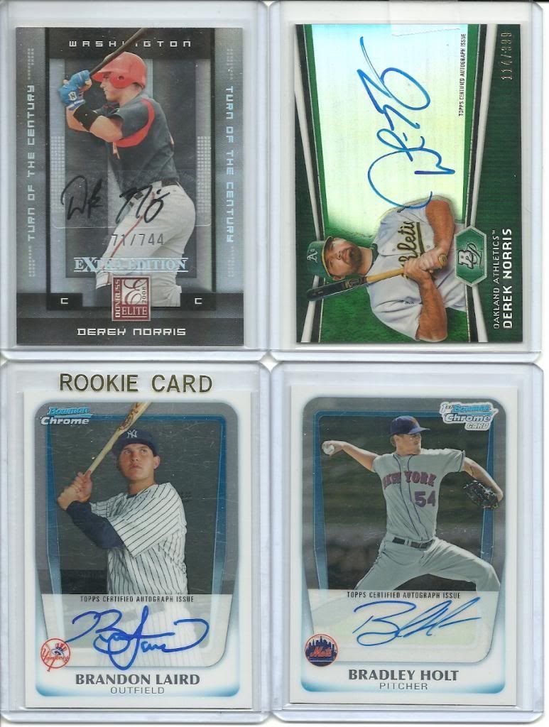 Please add $2.00 for shipping on first card, .25 cents per card after. Max you will have to pay is $3.00 Derek Norris EEE Turn of Century Auto 471/744 - $2 Derek Norris Bowman Platinum Green Auto 114/399 - $2 Bradley Holt Bowman Chrome Auto - $2 Brandon Laird Chrome Auto - $2 ![]() Jonathan Giffin Lot (2013 Bowman Blue 243/250; '13 Bowman Red Wave 19/25; '12 Bowman Chrome Auto) - $12 ![]() Mark Trumbo '13 Topps Series 2 Chasing History Auto - $12 Matt Moore '12 Topps Finest Green Auto 160/199 - $20 Addison Reed '12 Topps Finest Refractor Auto 65/198 - $6 Allen Craig '11 Topps Tier One "On The Rise" Auto 358/999 - $12 ![]() Bud Norris '08 Bowman Chrome Refractor Auto 324/500 - $5 Bud Norris '08 Bowman Chrome Blue Refractor Auto 143/150 - $25 David Ortiz '13 Topps Redemption Replacement Auto - $SOLD Gary Carter '13 Topps Redemption Replacement Auto - $20 David Wright '13 Topps Redemption Replacement Auto - $25