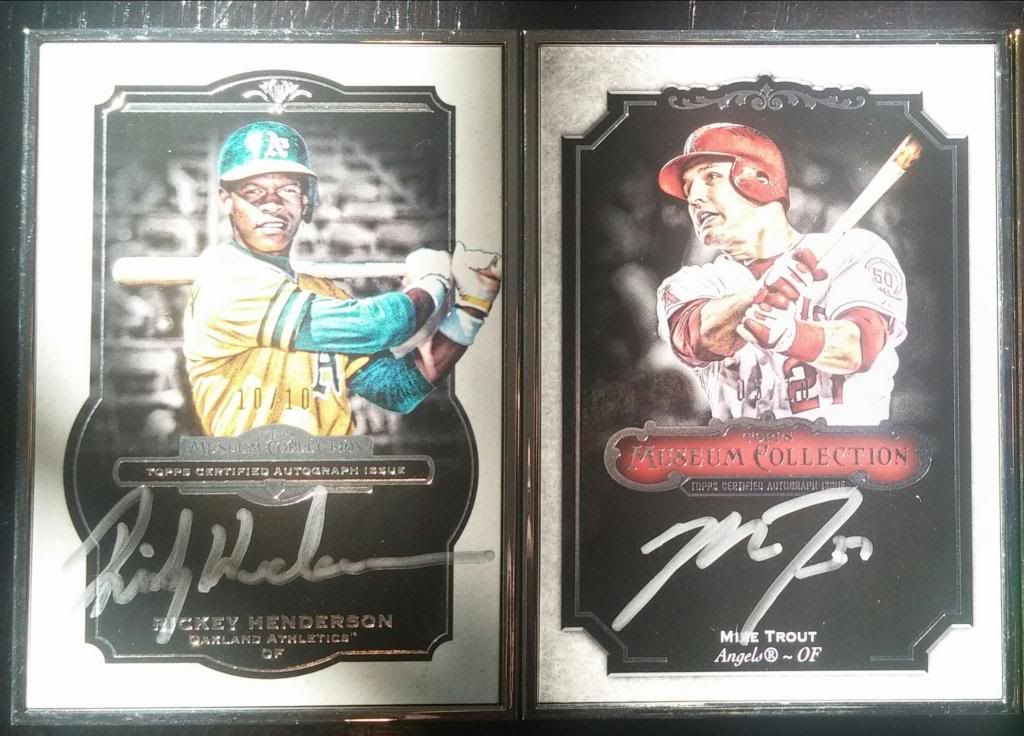| gold framed auto, mike trout, museum collection, rickey henderson, silver framed auto |