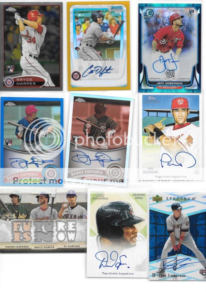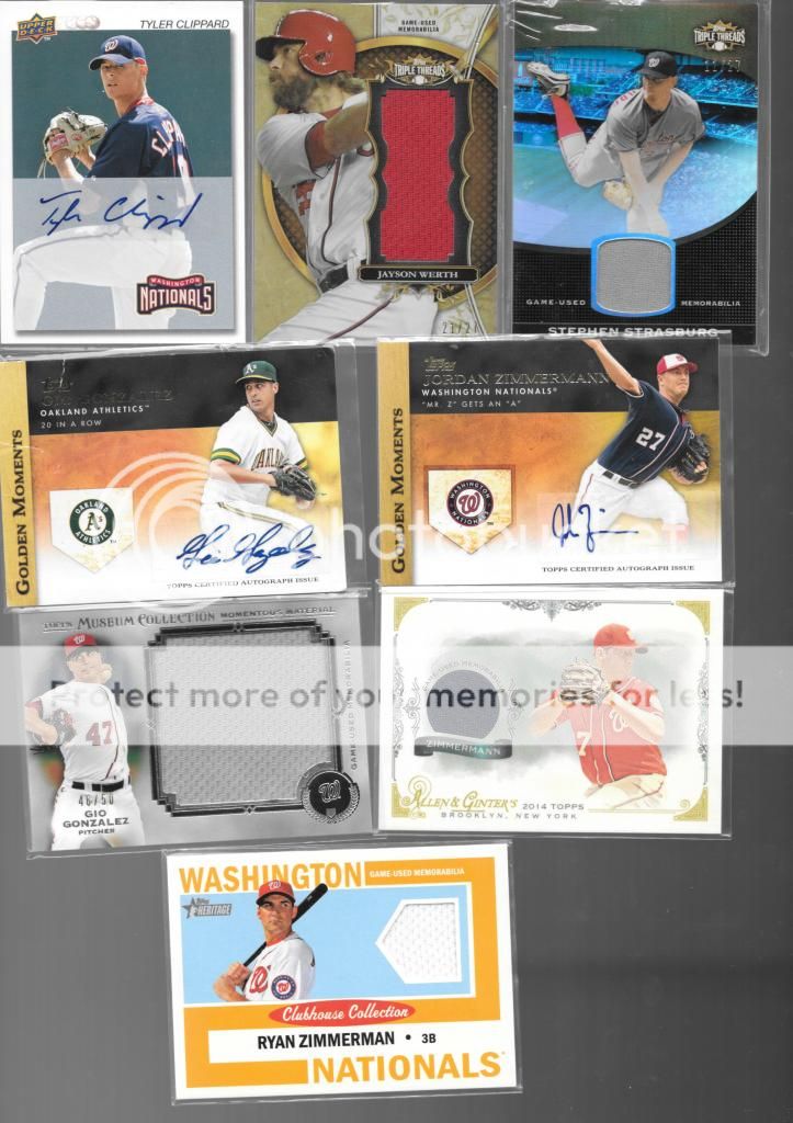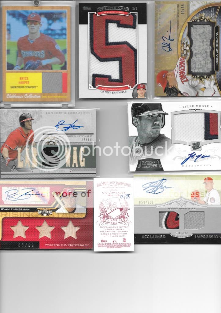 Looking for nice nats stuff of the following players! Anthony Rendon Ryan Zimmerman Jordan Zimmermann Bryce Harper Stephen strasburg Erick Fedde Jeff Kobernus Michael Taylor Also looking for these specific cards! really would love to add these to the pc!! Any 2013 bc Refractors of Eury Perez that I need for my rainbow(can get a list if interested) 2014 Gio Gonzalez Strata patch auto Framed Gio Gonzalez or Ryan Zimmerman museum autos 2014 topps chrome Ryan Zimmerman patch auto! Chrome autos of any of the above guys! I will scan in some of the nicer stuff I have for trade but feel free to check my bucket here: potatomeowQ's Library | Photobucket Also most anything is for sale so if you like something just ask for a price! ![]() ![]() Harper is gone! ![]() ![]() ![]() ![]() ![]() ![]() ![]() plate in below scan is gone! ![]() this will be very hard to get off me but you can offer ![]() let me know what you guys got! thanks, Zach