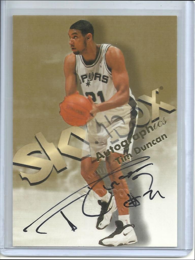 I recently started a Tim Duncan PC. For now I'm focusing on his RC's (in PSA 10 or BGS 9.5) and I hope to pick up that Skybox Autographics soon. If I find another decently priced auto I'll probably grab it also. Looks like his Ultra graded gem mint will be the hardest to obtain but I'll get one eventually.