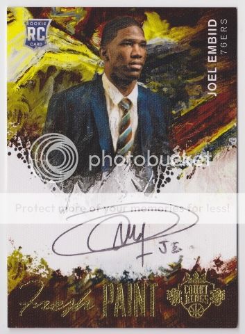 2014-15 Court Kings: Box 1: Box Topper(1): Ben McLemore Base(5): Eric Bledsoe, Jeff Green, O.J. Mayo, Joe Johnson, Nick Johnson RC Portrait(1): James Young Ruby/99 Royal Performances(1): David Thompson New Aesthetic(1): Elfrid Payton Artistic Endeavors Jerseys(1): Pau Gasol /299 Fresh Paint(1): Joel Embiid /225 ![]() Box 2: Box Topper(1): Terrence Ross Base(5): Al Horford, Kyrie Irving, Andre Iguodala, Derrick Rose, Spencer Dinwiddie Variation /225 Portrait(1): Clint Capela /149 Royal Performances(1): Tracy McGrady New Aesthetic(1): James Young Sapphire /25 Art Nouveau(1): Dante Exum /299 Impressionist Ink(1): Tim Hardaway Jr. /99 ![]() 2012-13 Crusade: Box 1: Base(17) : Kobe Bryant, LeBron James, Klay Thompson RC, Bradley Beal RC Insert(1): Knight Court Chauncey Billups Prizms(6): E'Twaun Moore, Isiah Thomas, Marcus Morris, Alec Burks, Joe Dumars Red/99, Marcin Gortat Purple/49 Jerseys(3): Kemba Walker, Greg Monroe, Enes Kanter Autographs(3): Kenneth Faried...just finished trading for this one, so of course I pull it now (Thanks Rune!), Mo Harkless, Will Barton (redemption) ![]() Box 2: Base(17) : Kyrie Irving RC, Damian Lillard RC Insert(1): Knight Court Steve Nash Prizms(6): Greg Stiemsma, Tyler Zeller, Mirza Teletovic, Gary Payton, Kobe Bryant Red 08/99, Jerseys(3): Rodney Stuckey, Andre Miller, Wesley Matthews Autos(3): Robert Sacre, Thomas Robinson Gold /25, Jon Leuer (redemption) ![]() Kobe packs: All base 2012-13 Panini Hoops: Artist Proof(1): Steve Novak Autographs(1): Charles Jenkins Draft Night Autographs(1): Terrence Ross ![]() 2012-13 Contenders: Silver Base(1): Emeka Okafor /25 Rookie Autographs(2): Jonas Valanciunas, Darius Morris, Kyle O'Quinn Historic Contenders Autographs(1): Rick Mahorn /149 ![]() ![]() 2012-13 Prestige: Bonus Shots: Kyrie Irving RC /249 Inside the Numbers Materials(2): Dwight Howard, Stephen Curry Prime /25 Distinctive Ink(1): Stephen Jackson (redemption-submitted) ![]() ![]() 2012-13 Elite: Aspirations(1): Kevin Love /58 Throwback Threads(1): Patrick Ewing Elite Signatures(1): Jeff Green /49 Rookie Inscriptions(2): Kent Bazemore, Harrison Barnes (redemption-submitted) ![]() ![]() Kobe Crusade and Kyrie Bonus shots NFT right now, everything else is pretty much fair game. Oh..and I picked up a case of 12-13 Prizm. I made it about halfway through before running out of penny sleeves, so I'm stuck waiting on another case (of sleeves, not Prizm) to arrive.