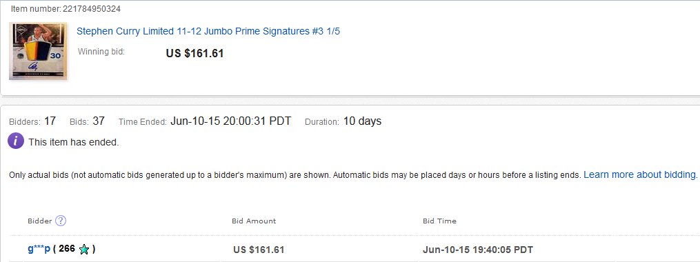 thread made: 06-17-2015, 09:29 AM (eastern) original ebay listing ended: Jun 17, 2015 , 7:52AM (pacific = 10:52 eastern) current ebay listing ends: Time left: 1 day 4 hours Saturday, 11:21PM Saturday is June 20th. Since this has more than a full day left it is not (obviously) a 1 day listing. Therefore it was either listed the 17th (3 day - would be my guess) or the 15th (5 day). So if you did not get the card on the 17th, then how did you have the card later on the 17th to list?