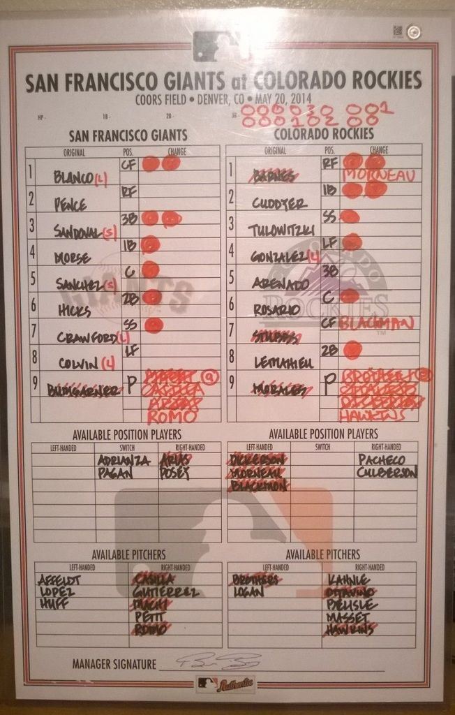Game used, dugout lineup card, MLB Authenticated, Bruce Bochy signature on the bottom. Giants at Rockies, May 20th, 2014. Bumgarner started. Posey got the day off apparently. Giants actually lost this game in the bottom of the 9th, but whatever, they won the season. The Giants lineup at the time just make me like this years' lineup that much better. Also of note, this was the 18th straight road game that Bumgarner started in which he allowed 3 ERs or fewer, a Giants record.