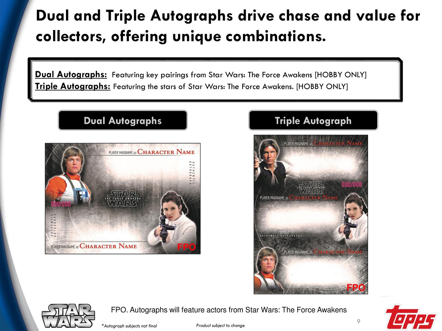 Didn't see a thread yet for this set. http://www.blowoutcards.com/forums/b...ml#post9576771 2015 TOPPS STAR WARS THE FORCE AWAKENS SERIES 1 DELIVERS (2) "HITS" IN EVERY BOX INCLUDING: AUTOGRAPHS, DUAL & TRIPLE AUTOGRAPHS, SKETCH CARDS, MEDALLION CARDS, PRINTING PLATES AND MORE! EVERY BOX WILL ALSO DELIVER (24) INSERT CARDS AND (24) PARALLELS. SET MAKE-UP Autograph Cards Base Autograph Cards (Approximately 100/signer) Purple Autograph Parallels (#'d to 25) Gold Autograph Parallels (#'d to 10) Imperial Guard Red Autograph Parallels (1 of 1) Dual Autograph Cards (3 combinations #'d to 3) Triple Autograph Cards (2 combinations #'d to 3) Sketch Cards (Approximately 3500) Medallions - The Resitance and The First Order, 8 characters of each medallion Bronze (399/subject) Silver (250/subject) Gold (99/subject) Printing Plates Base (650 total) Autographed (4/subject) Base Set (100) Insert Sets (18) Character Stickers (9) Character Montages (9) Aliens & Creatures (9) The First Order (9) Blueprints Parallel Sets Lightsaber Green (1 per pack) Lightsaber Blue (1:2 packs) Lightsaber Purple (1:4 packs) Lightsaber Neon Starfield (1:6 packs) Gold (#'d to 100) Platinum (1 of 1) If we make the assumption of (1) Medallion per box as 1 of the 2 hits, then we're looking at: (399 bronze +250 silver +99 gold)*(2 styles*8 characters/style)=11,968 boxes / 12 boxes/case = 997.33 cases. I'm guessing there will be some retail for this, but no proof yet of that.
