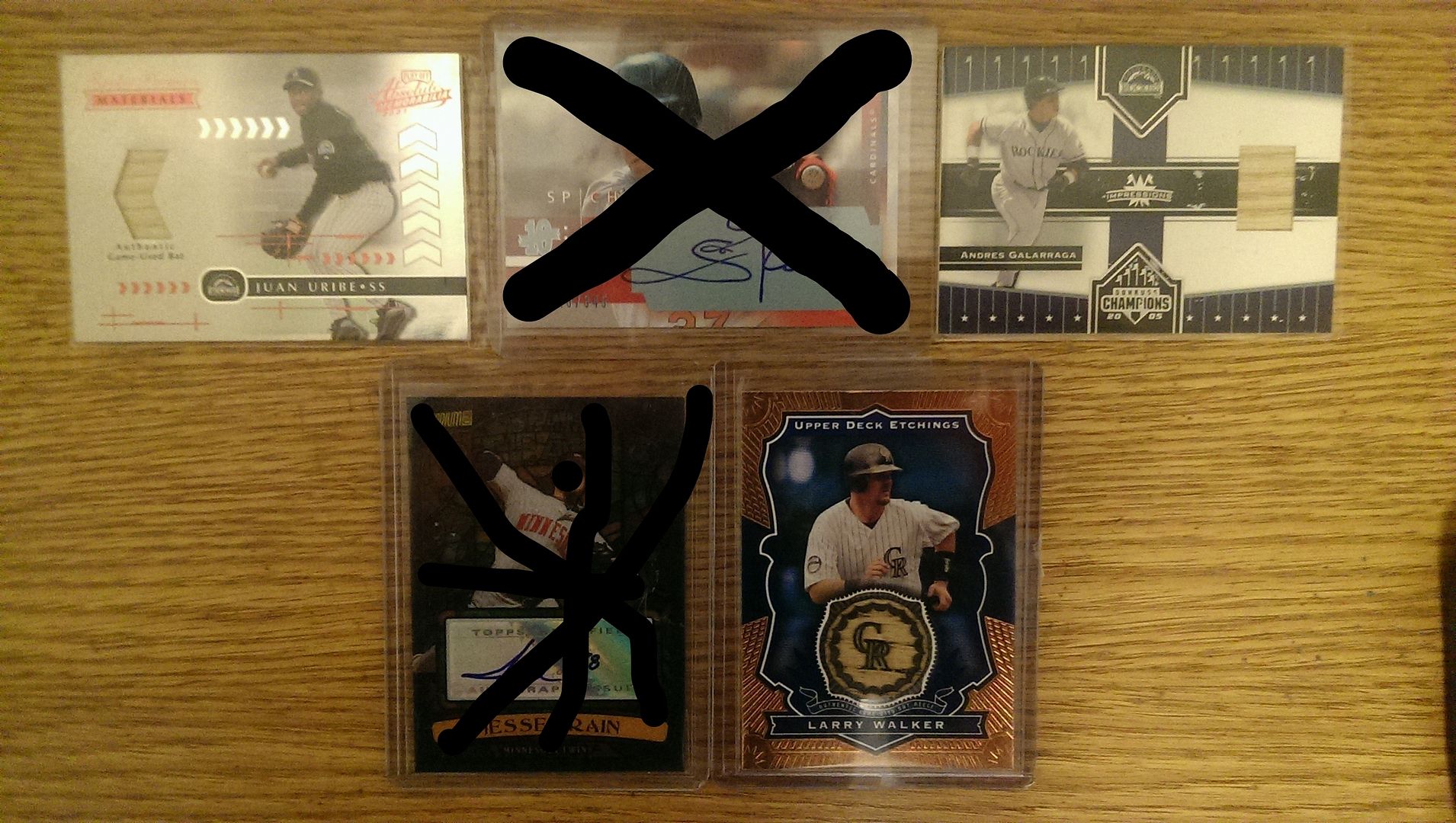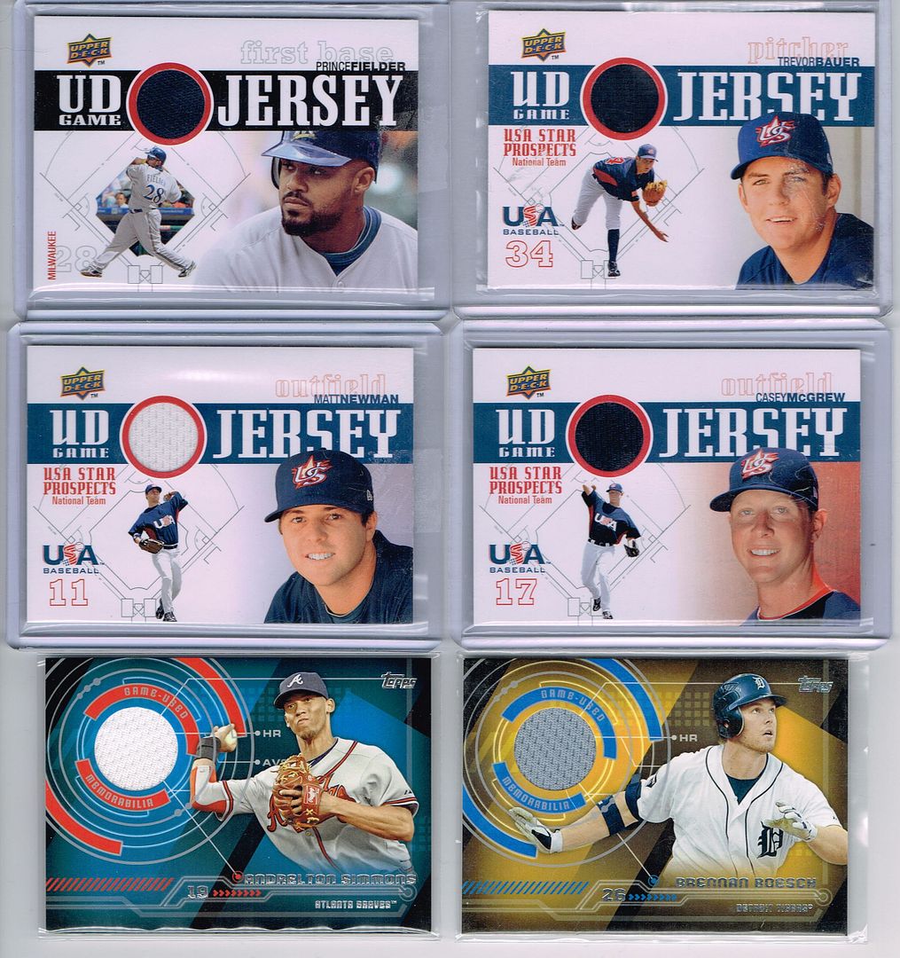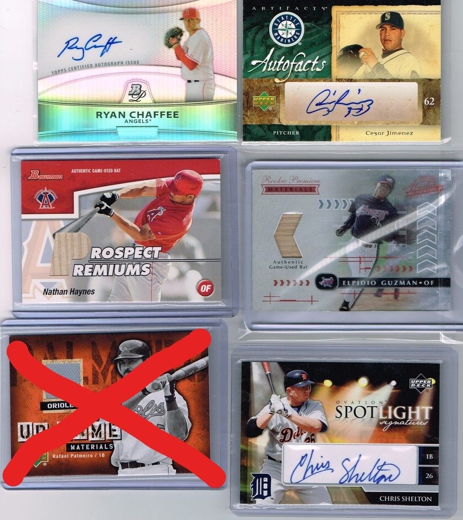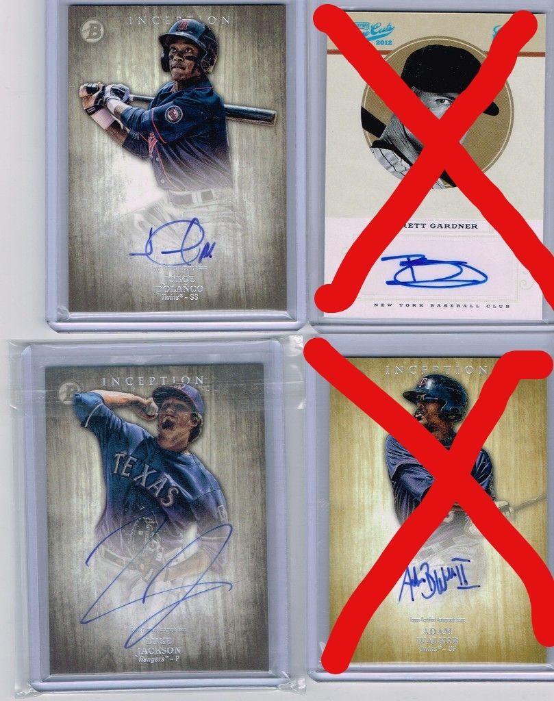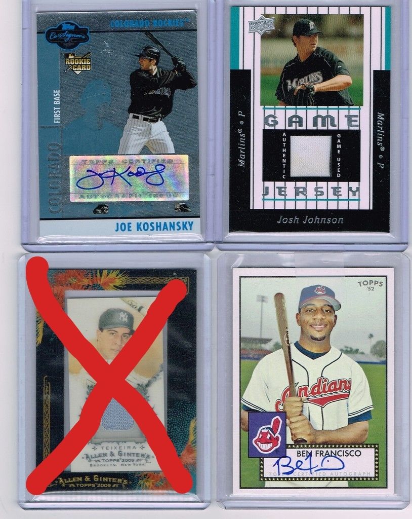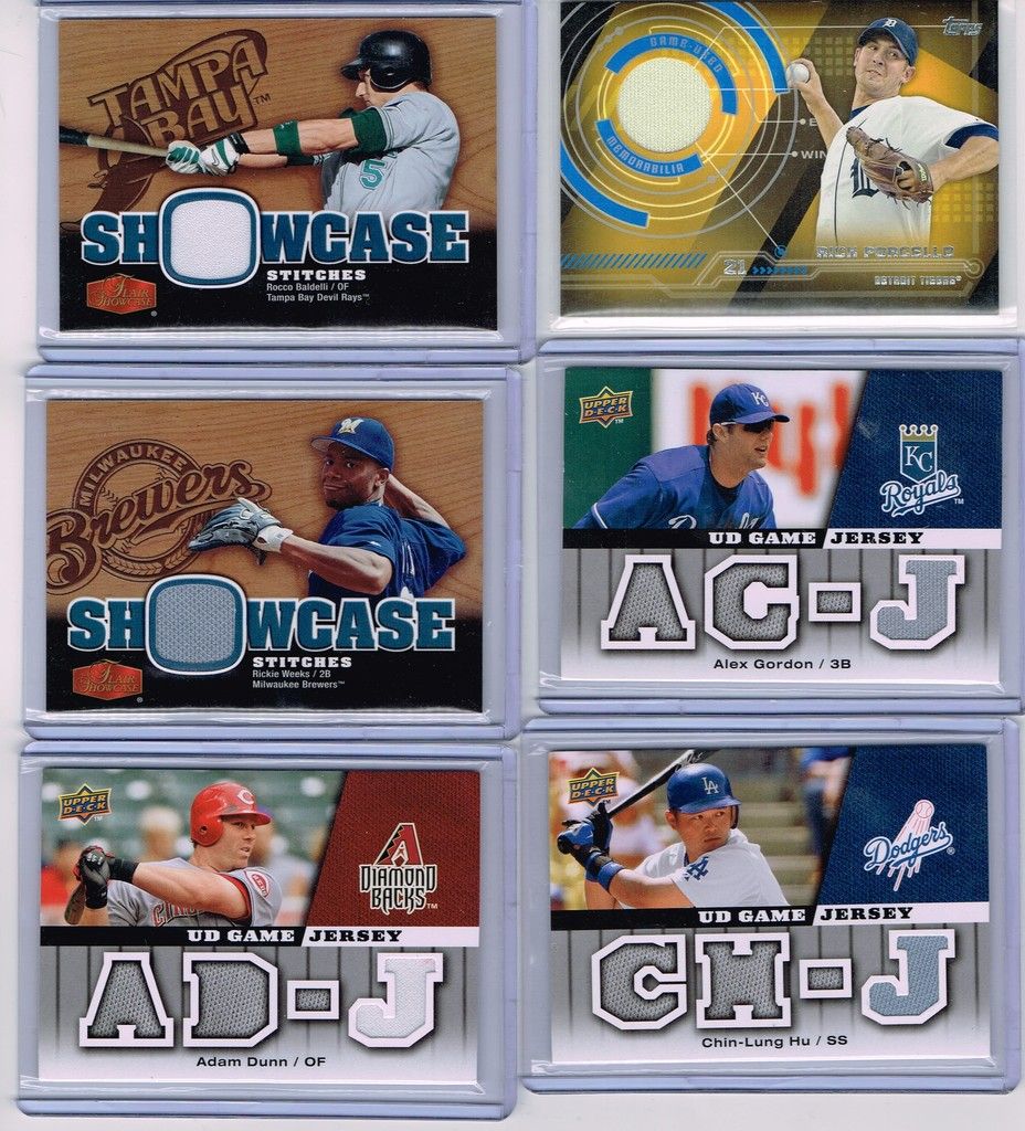 Looking for Carlos Gonzalez, Sam Fuld, Arenado, Helton, Joe Mauer, Seth Smith, Justin Morneau, Cuddyer, Joe Nathan, Brian Roberts, 2007 SPX Patches, and 2007 Turkey Red Chrome Refractors (/999). I'm not interested in base, inserts, or parallels at this time. If buying, $2.50 for shipping. Ian Kennedy Triple Patch 1/3 $30 Lance Berkman/Jeff Bagwell Dual Bat /250 $5 Troy Tulowitzki RC Auto $15 Carlos Gonzalez Gold Refractor /50 $4 Blue *************************GONE******************** ![]() Edinson Volquez Patch Auto /50 $17 Edinson Volquez Auto /150 $7 Kell *********************GONE************* Cepeda **********************GONE********** ![]() Anibal Sanchez RC AU $5 Mike Montgomery RC AU /922 $3.50 J.R. Murphy RC AU Relic /299 $2.50 Elvis Andrus Mini Relic $2.00 Joe Koshansky AU $2.00 ![]() Juan Uribe GU Bat /700 $3.00 Andres Galarraga GU Bat (surface damage) $1.50 Jesse Crain AU $2.50 Larry Walker GU Bat $3.00 ![]() Miguel Almonte AU x2 $3.00 Brooks Robinson Commemorative Medallion $4.00 ![]() Prince Fielder GU $3.00 Trevor Bauer GU $4.50 Matt Newman GU $2.00 Casey McGrew GU $2.00 Andrelton Simmons GU $2.00 Brennan Boesch GU $2.00 ![]() Addison Reed AU $3.00 Stryker Trahan Refractor AU $3.50 Roenis Elias AU $3.00 ![]() Wade Miley AU ************************GONE**************************************** Wade Miley GU /36 $3.50 Miguel Montero GU $2.50 Nomar Garciaparra GU (Slight damage to corners and edges) $6 ![]() Jake Barrett GU AU $2.50 Carlos Quentin RC AU $2.50 Chris Owings Refractor RC AU $3.00 Jeff Kent GU $2.00 Jose Bautista Commemorative Hat Logo $5.00 Morgan Ensberg GU $2.00 Erik Johnson AU ****************************GONE********************************* ![]() Mike Minor Blue Refractor AU /199 $8.00 Ryan Burr GU /49 $3.50 ![]() Taylor Jordan Triple GU RC AU /35 $8.00 Alex Roidriguez GU $5.00 David Murphy RC AU /150 $3.00 ![]() Dante Bichette Jr. AU /299 $5.00 Joe Koshansky AU /300 $2.00 Adam LaRoche AU $3.00 Kaleb Cowart AU $2.50 ![]() Jorge Polanco AU $3.00 Luke Jackson AU $3.00 ![]() Trevor Hoffman Silver /50 $1.50 Jose Vidro GU $2.50 Aaron Myette GU $1.50 ![]() Javy Lopez GU $2.50 Eric Surkamp GU $2.00 Preston Wilson GU $2.50 Dallas McPherson GU $2.00 ![]() Joe Koshansky AU /199 $2.00 Josh Johnson GU $2.50 Ben Fransisco AU $2.00 ![]() Evan Meek AU $2.00 Kevin Hart AU $2.00 Eric Chavez GU $2.50 Ross Ohlendorf AU $2.00 ![]() Carlos Contreras Green Refractor /75 $3.00 Zach Petrick AU $3.00 Trevor Cahill AU $2.00 Jamaine Cotton AU /499 $2.50 ![]() Carlos Pena AU $3.00 Mark Ellis AU $2.50 Chien-Ming Wang GU $3.50 Carlos Villanueva AU $2.50 Jim Thome GU $3.00 ![]() Rocco Baldelli GU $2.00 Rick Porcello GU $2.00 Rickie Weeks GU $2.00 Alex Gordon GU $3.00 Adam Dunn GU $3.00 Chin-Lung Hu GU $2.00 ![]() Ryan Chaffee AU $2.00 Cesar Jimenez AU $2.00 Nathan Haynes GU $1.50 Elpidio Guzman GU /700 $2.00 Chris Shelton AU $2.00