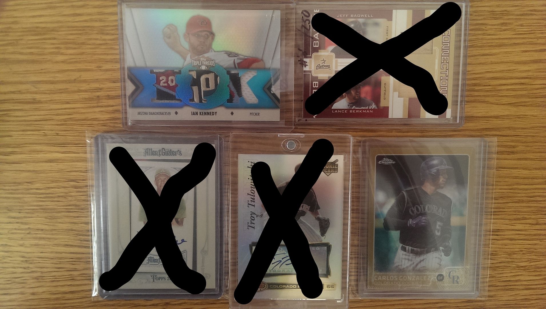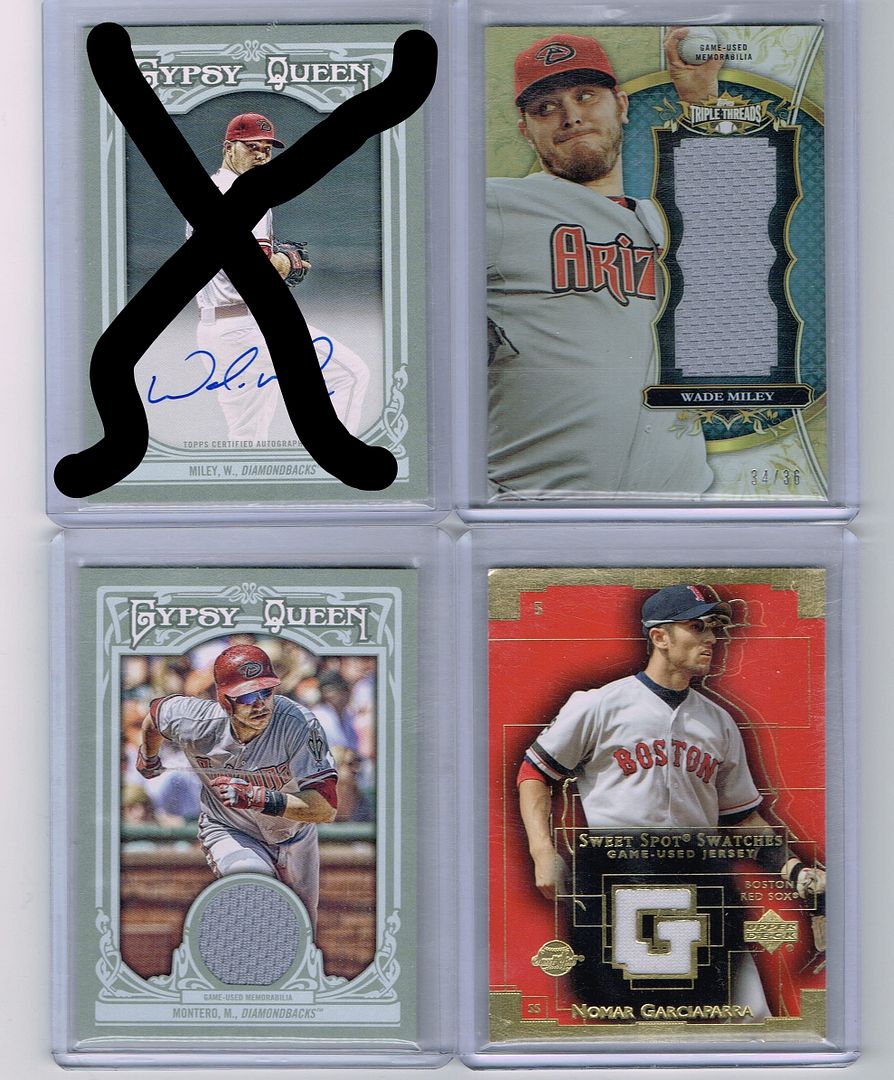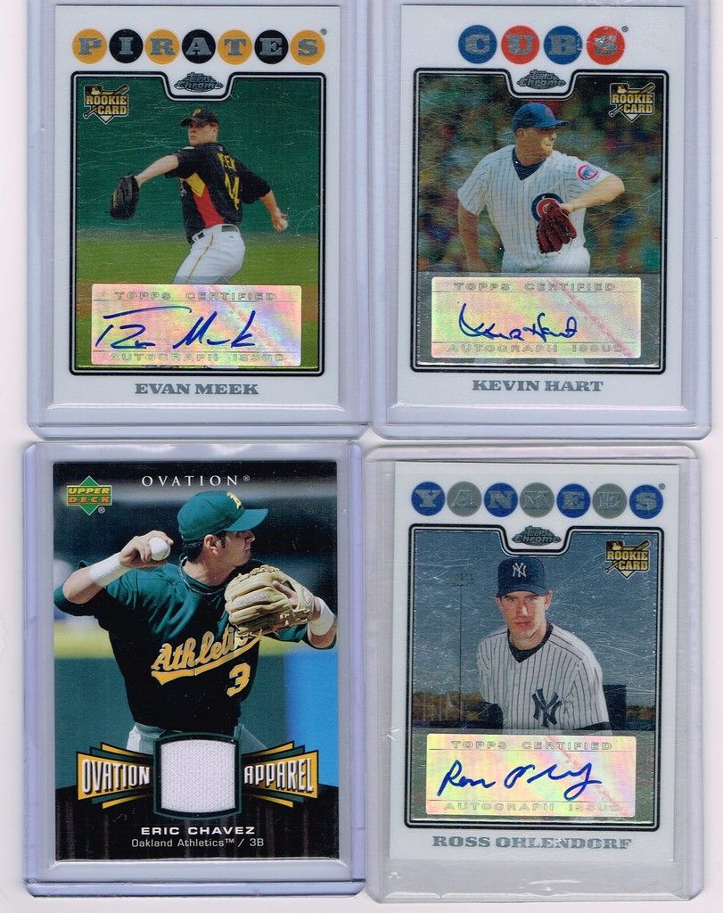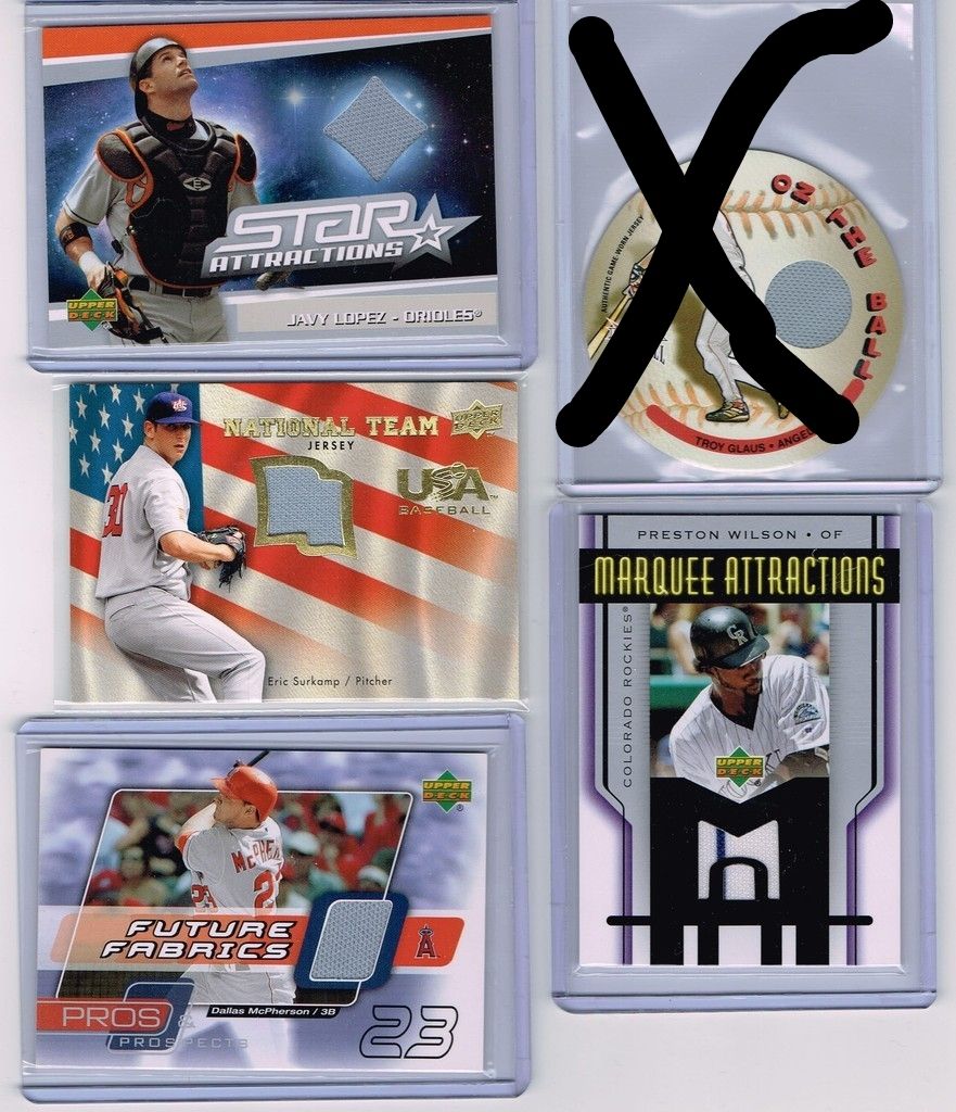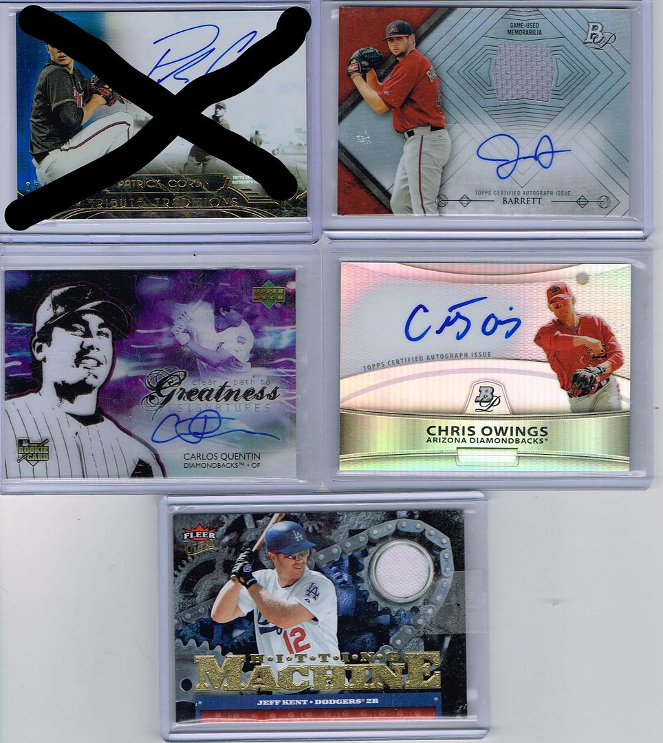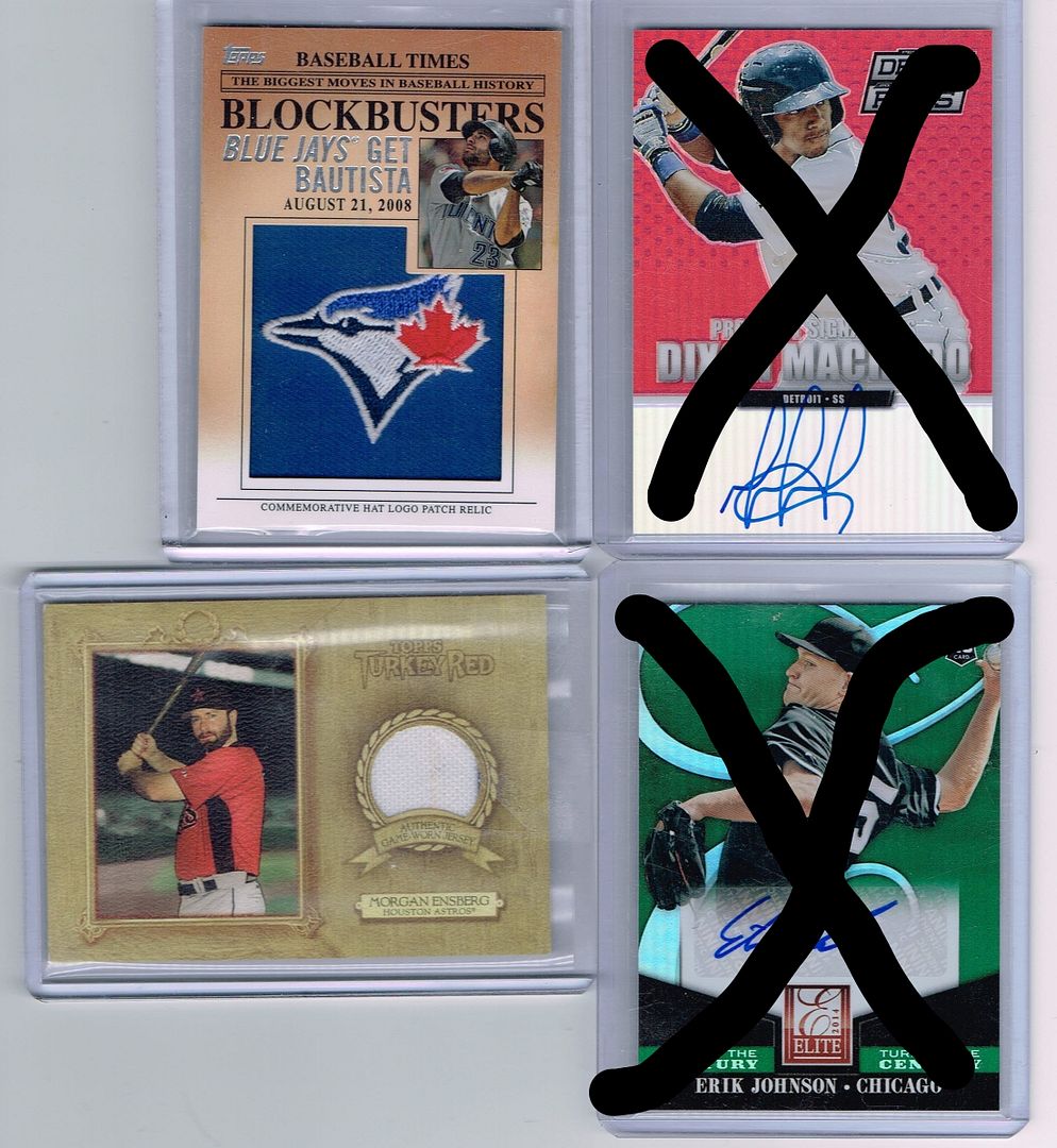 Looking for Carlos Gonzalez, Sam Fuld, Arenado, Helton, Joe Mauer, Seth Smith, Justin Morneau, Cuddyer, Joe Nathan, Brian Roberts, 2007 SPX Patches, and 2007 Turkey Red Chrome Refractors (/999). I'm not interested in base, inserts, or parallels at this time. If buying, $2.50 for shipping. Ian Kennedy Triple Patch 1/3 $30 Lance Berkman/Jeff Bagwell Dual Bat /250 $5 Troy Tulowitzki RC Auto $15 Carlos Gonzalez Gold Refractor /50 $4 Blue *************************GONE******************** ![]() Edinson Volquez Patch Auto /50 $17 Edinson Volquez Auto /150 $7 Kell *********************GONE************* Cepeda **********************GONE********** ![]() Anibal Sanchez RC AU $5 Mike Montgomery RC AU /922 $3.50 J.R. Murphy RC AU Relic /299 $2.50 Elvis Andrus Mini Relic $2.00 Joe Koshansky AU $2.00 ![]() Juan Uribe GU Bat /700 $3.00 Andres Galarraga GU Bat (surface damage) $1.50 Jesse Crain AU $2.50 Larry Walker GU Bat $3.00 ![]() Miguel Almonte AU x2 $3.00 Brooks Robinson Commemorative Medallion $4.00 ![]() Prince Fielder GU $3.00 Trevor Bauer GU $4.50 Matt Newman GU $2.00 Casey McGrew GU $2.00 Andrelton Simmons GU $2.00 Brennan Boesch GU $2.00 ![]() Addison Reed AU $3.00 Stryker Trahan Refractor AU $3.50 Roenis Elias AU $3.00 ![]() Wade Miley AU ************************GONE**************************************** Wade Miley GU /36 $3.50 Miguel Montero GU $2.50 Nomar Garciaparra GU (Slight damage to corners and edges) $6 ![]() Jake Barrett GU AU $2.50 Carlos Quentin RC AU $2.50 Chris Owings Refractor RC AU $3.00 Jeff Kent GU $2.00 Jose Bautista Commemorative Hat Logo $5.00 Morgan Ensberg GU $2.00 Erik Johnson AU ****************************GONE********************************* ![]() Mike Minor Blue Refractor AU /199 $8.00 Ryan Burr GU /49 $3.50 ![]() Taylor Jordan Triple GU RC AU /35 $8.00 Alex Roidriguez GU $5.00 David Murphy RC AU /150 $3.00 ![]() Dante Bichette Jr. AU /299 $5.00 Joe Koshansky AU /300 $2.00 Adam LaRoche AU $3.00 Kaleb Cowart AU $2.50 ![]() Jorge Polanco AU $3.00 Luke Jackson AU $3.00 ![]() Trevor Hoffman Silver /50 $1.50 Jose Vidro GU $2.50 Aaron Myette GU $1.50 ![]() Javy Lopez GU $2.50 Eric Surkamp GU $2.00 Preston Wilson GU $2.50 Dallas McPherson GU $2.00 ![]() Joe Koshansky AU /199 $2.00 Josh Johnson GU $2.50 Ben Fransisco AU $2.00 ![]() Evan Meek AU $2.00 Kevin Hart AU $2.00 Eric Chavez GU $2.50 Ross Ohlendorf AU $2.00 ![]() Carlos Contreras Green Refractor /75 $3.00 Zach Petrick AU $3.00 Trevor Cahill AU $2.00 Jamaine Cotton AU /499 $2.50 ![]() Carlos Pena AU $3.00 Mark Ellis AU $2.50 Chien-Ming Wang GU $3.50 Carlos Villanueva AU $2.50 Jim Thome GU $3.00 ![]() Rocco Baldelli GU $2.00 Rick Porcello GU $2.00 Rickie Weeks GU $2.00 Alex Gordon GU $3.00 Adam Dunn GU $3.00 Chin-Lung Hu GU $2.00 ![]() Ryan Chaffee AU $2.00 Cesar Jimenez AU $2.00 Nathan Haynes GU $1.50 Elpidio Guzman GU /700 $2.00 Chris Shelton AU $2.00